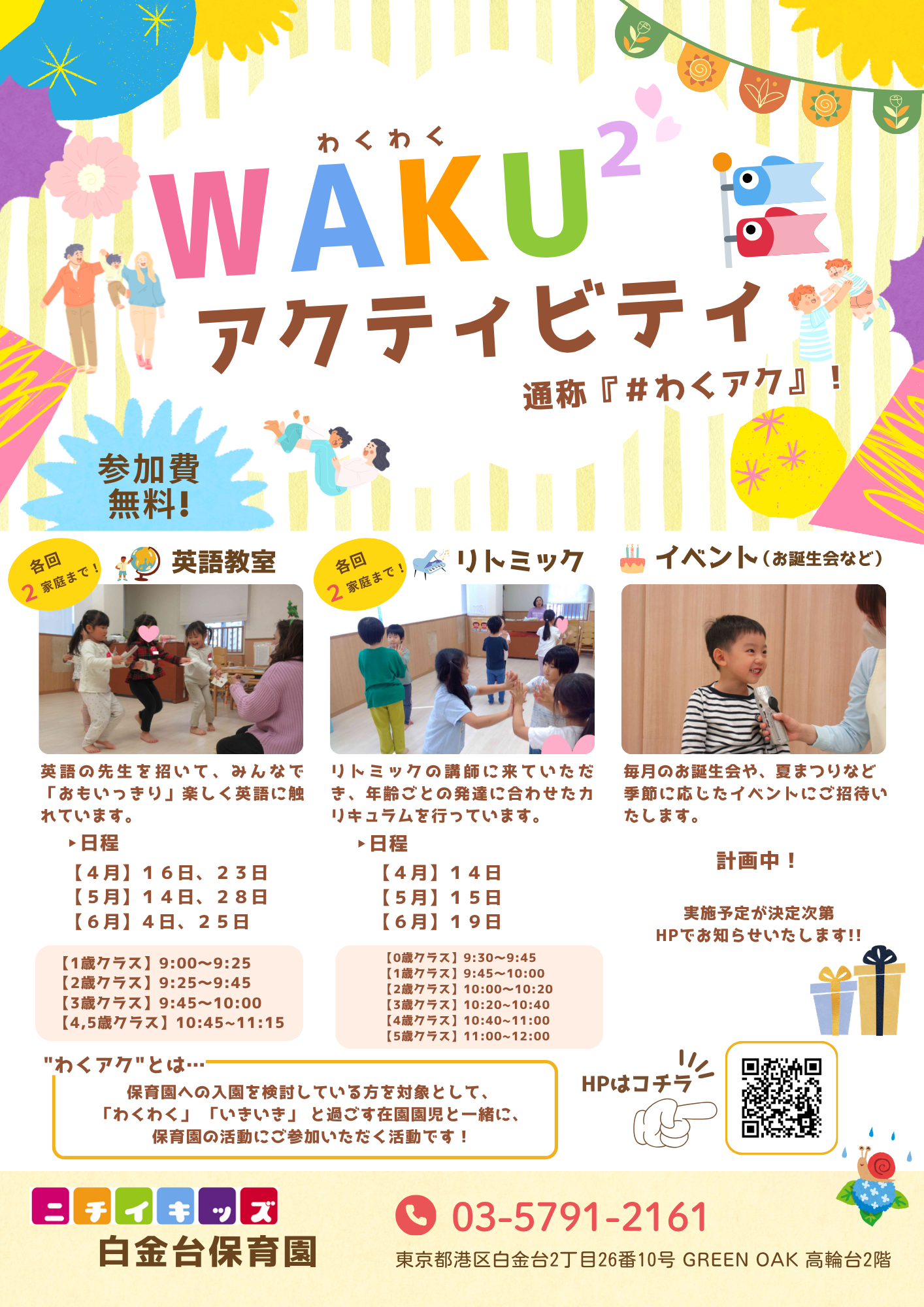 高輪台駅から徒歩1分という好立地にある、定員60名の認可保育園です。通園しやすい便利な環境に加え、周辺には複数の公園が点在しており、子どもたちは発達段階や興味関心に合わせて、日々のびのびと体を動かすことができます。園庭はありませんが、地域の環境を活かした多様な保育を実践しています。