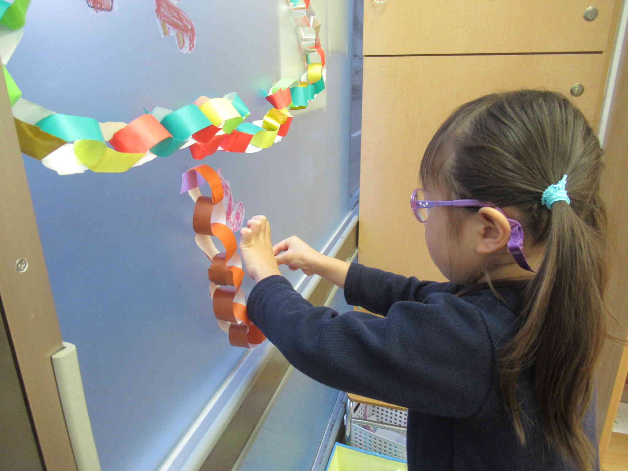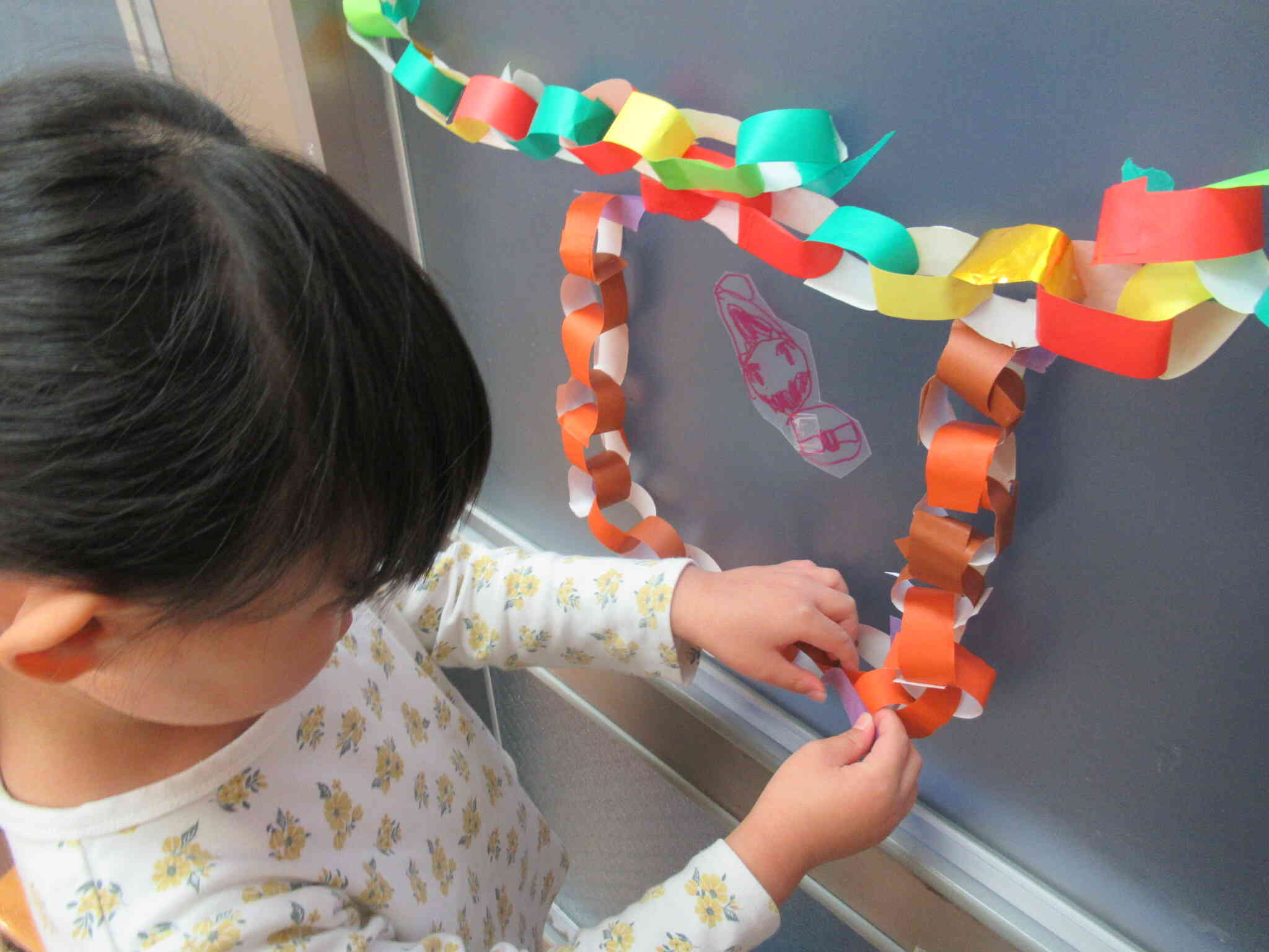 折り紙でわっかを作ったり、クリアーファイルに油性ペンで描いたイラストに色付けをしてみました。