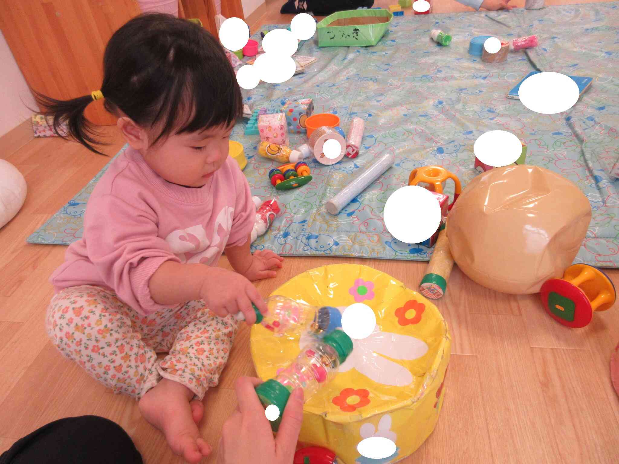 太鼓遊びを楽しんでいる様子です。手作り楽器をばちに見立てて太鼓遊びに夢中の子どもたちでした。とってもかわいいです。