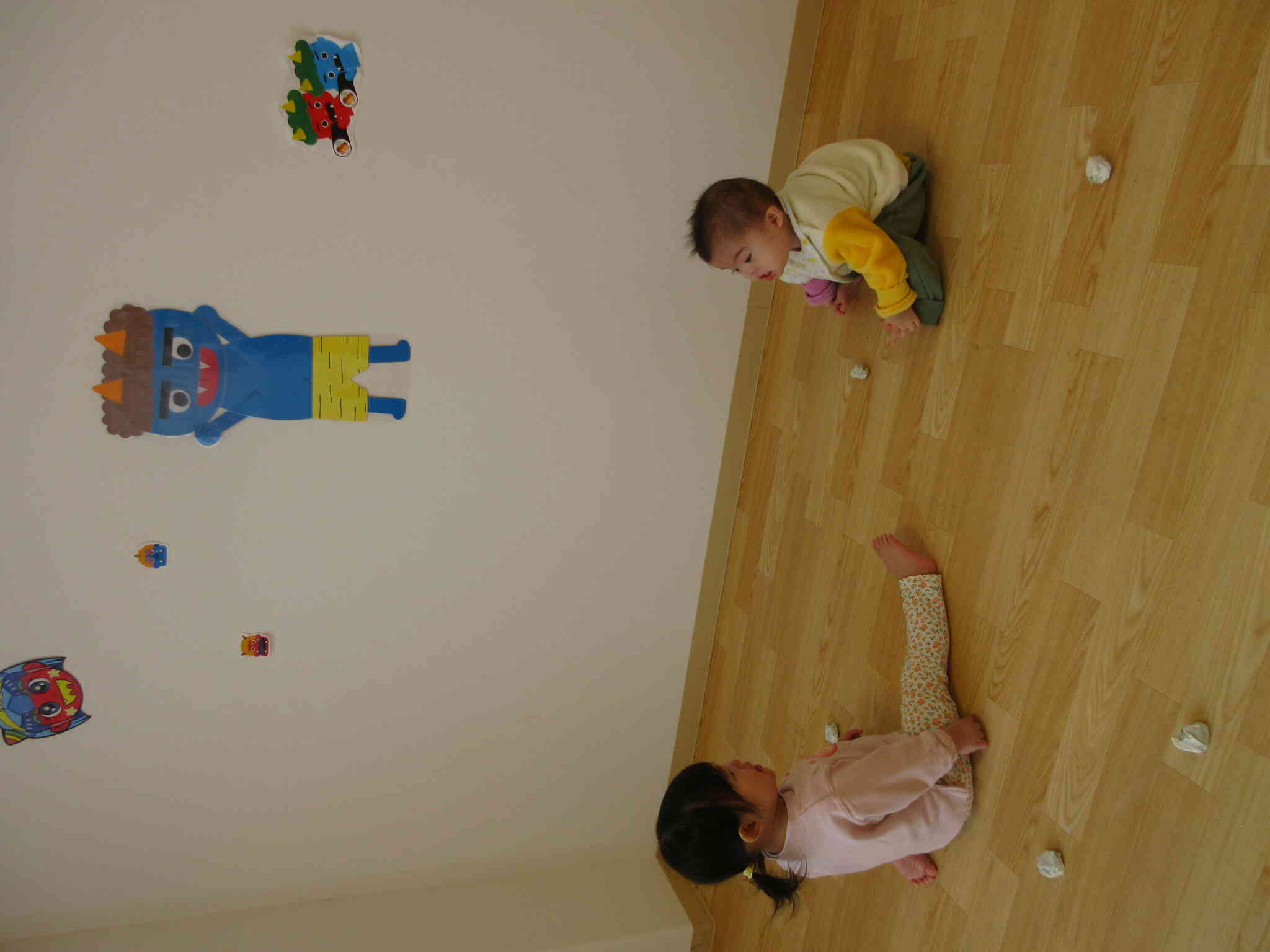 雪が降る寒い日が続いていますね。0歳児のみんなは暖かいお部屋の中で元気いっぱい遊んでいます。音楽に合わせてノリノリでマラカスを振って演奏中です。