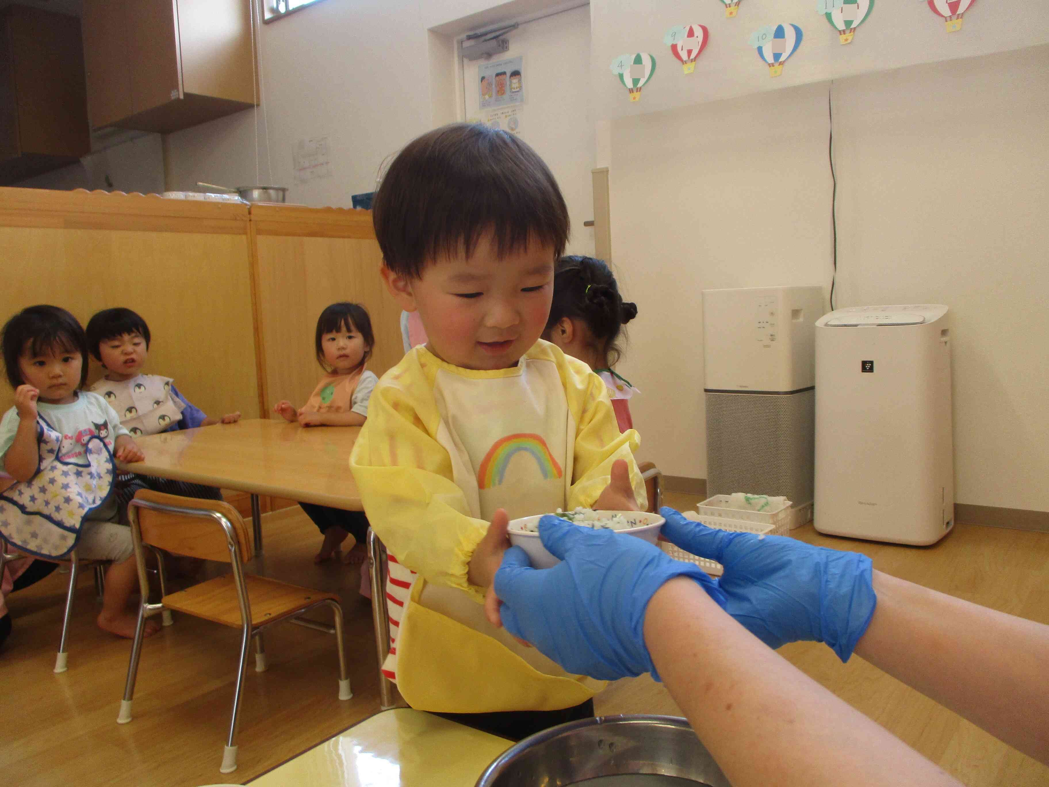 と、2歳児うさぎ組のお友だちは興味津々でした。