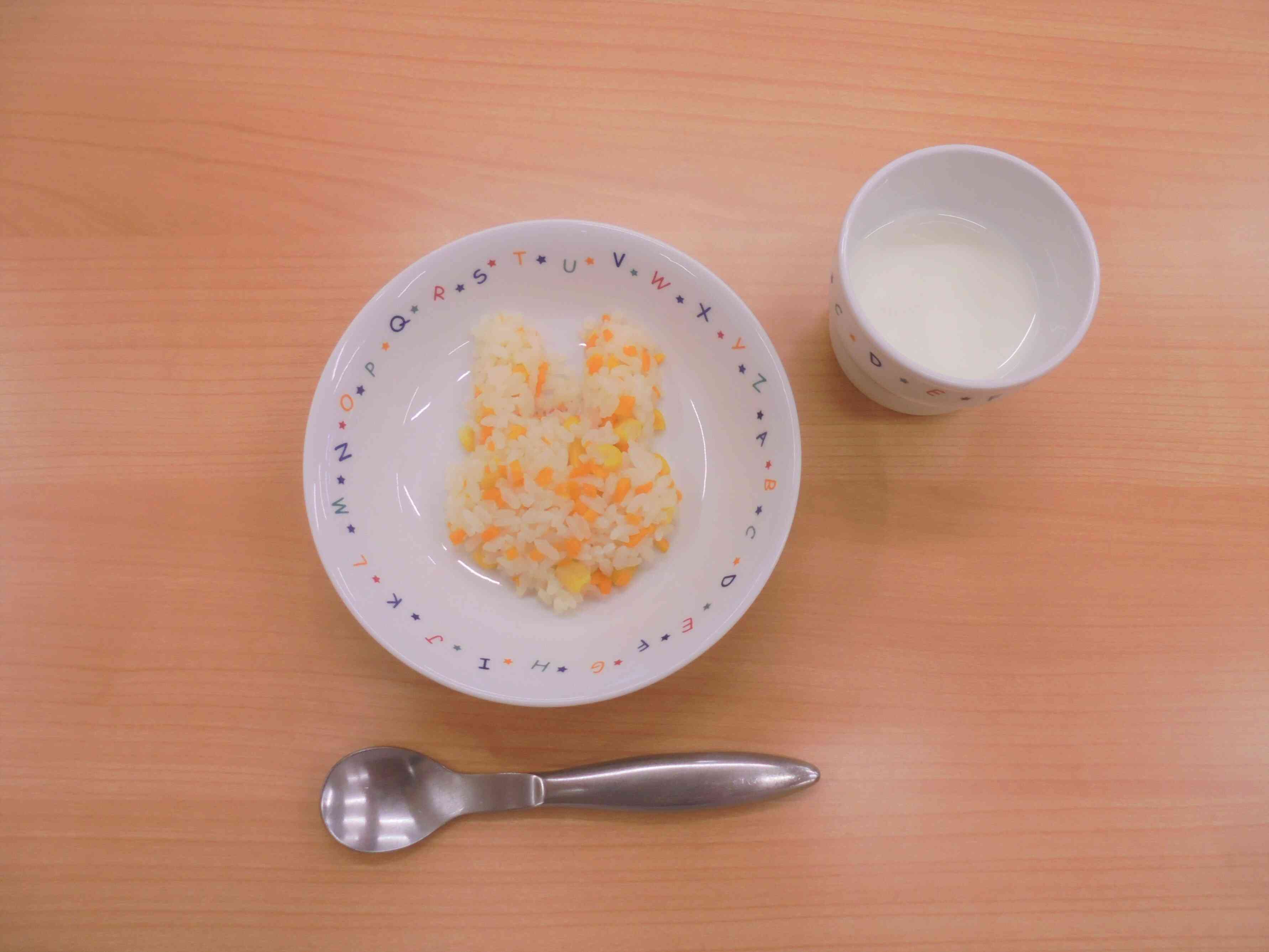 今日の給食は、うさぎの形のカレーピラフが出ました。クマさんかな、うさぎさんかなと興味津々で見ていた子ども達。「どこから食べようかな」「とうもろこしみたいな耳だね」と気になったことを保育者やお友達とお話して楽しんでましたよ。
