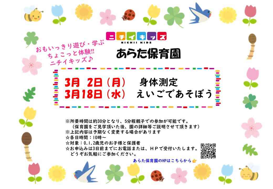 0歳児から2歳児の皆さんに向けて、子育て支援の一環として開催しているイベント、「ちょこっと体験!ニチイキッズ」 是非、保育園へお越しください☆
