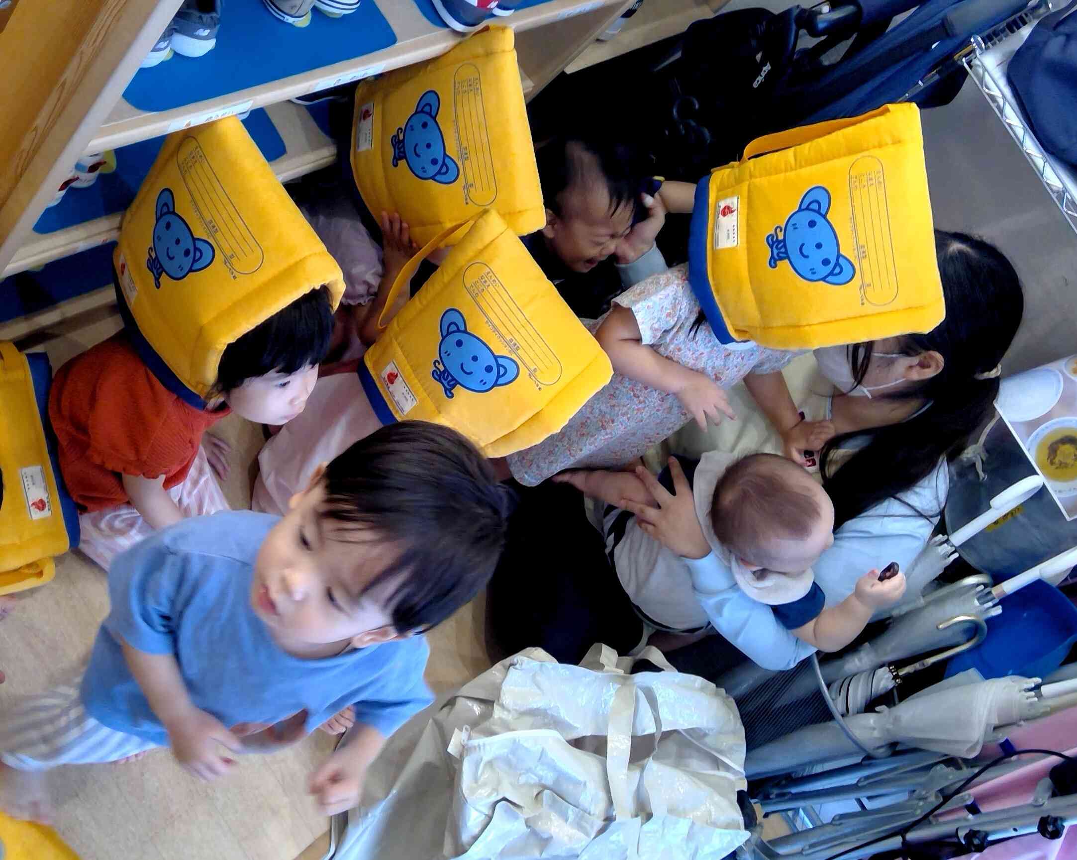 突然、保育室内が暗くなり、子どもたちは大きな揺れと警報音でビックリしていましたが、