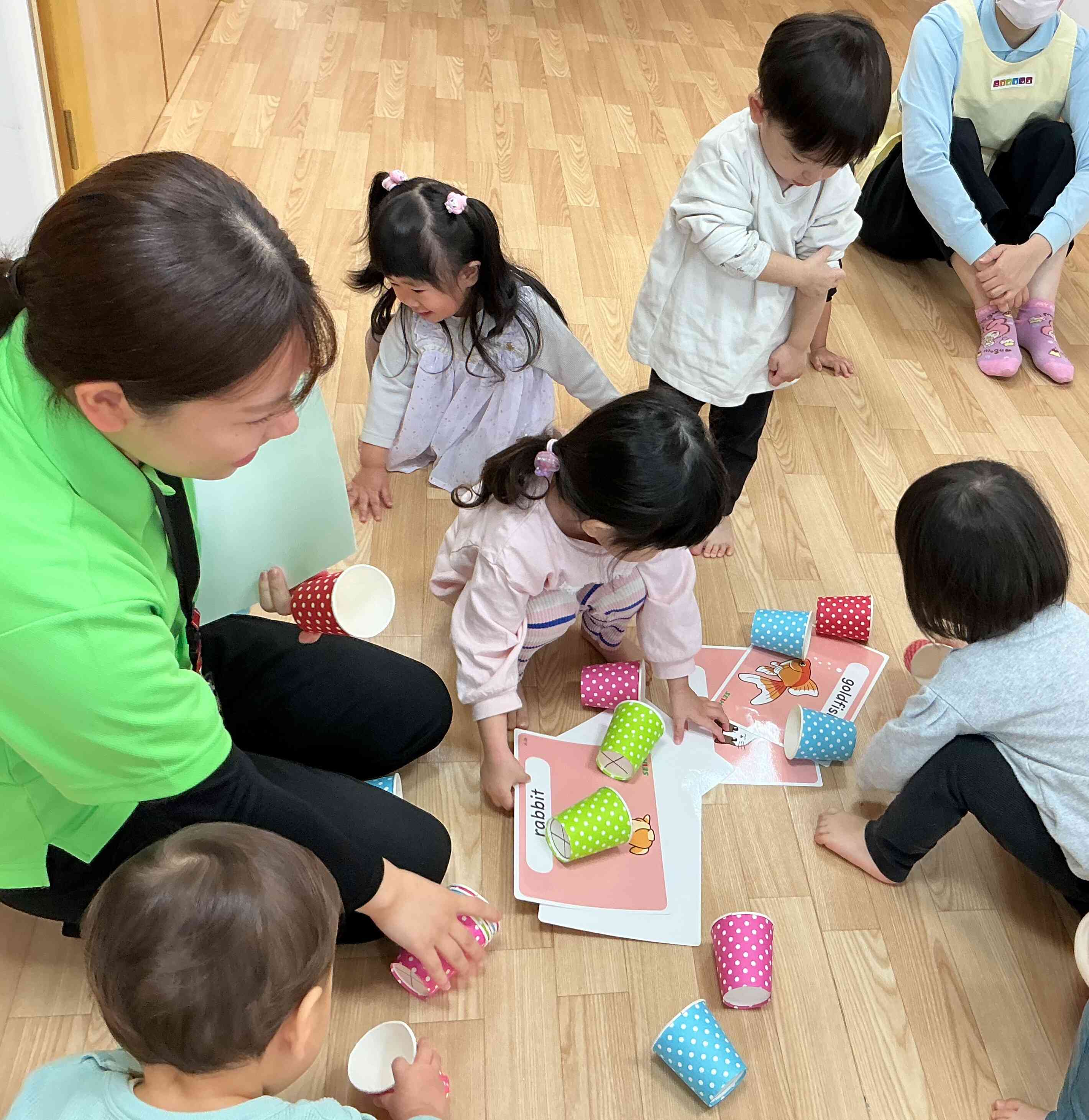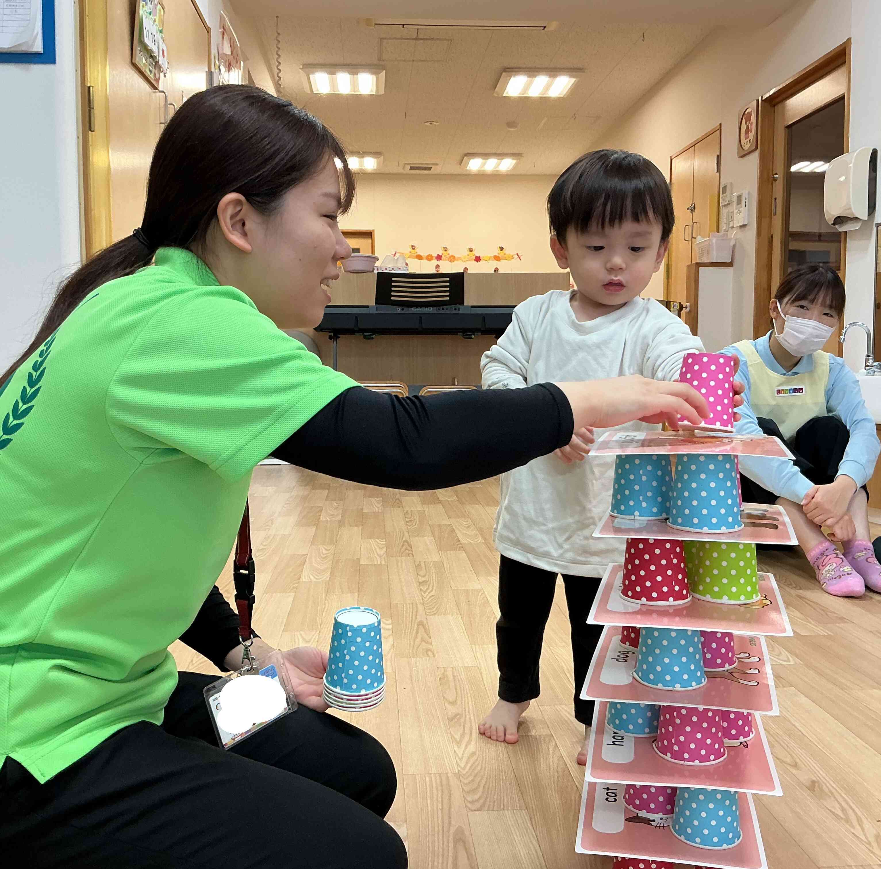 カードを見ながら、答えた後に紙コップを乗せて高くなると「おー!」と言って喜んでいました♪(๑ᴖ◡ᴖ๑)♪