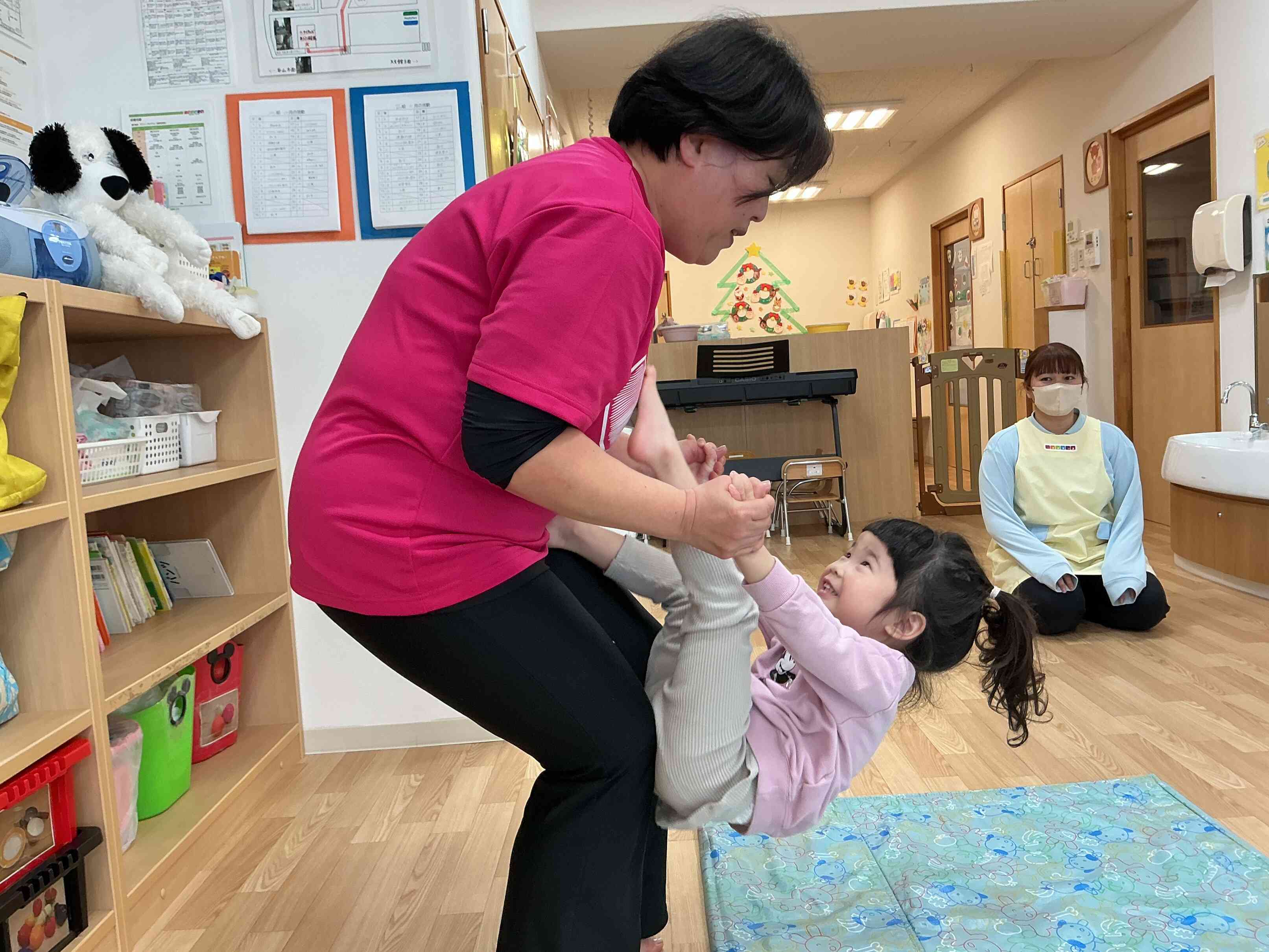 先生の膝にのって、くるりんと回転することに挑戦‼