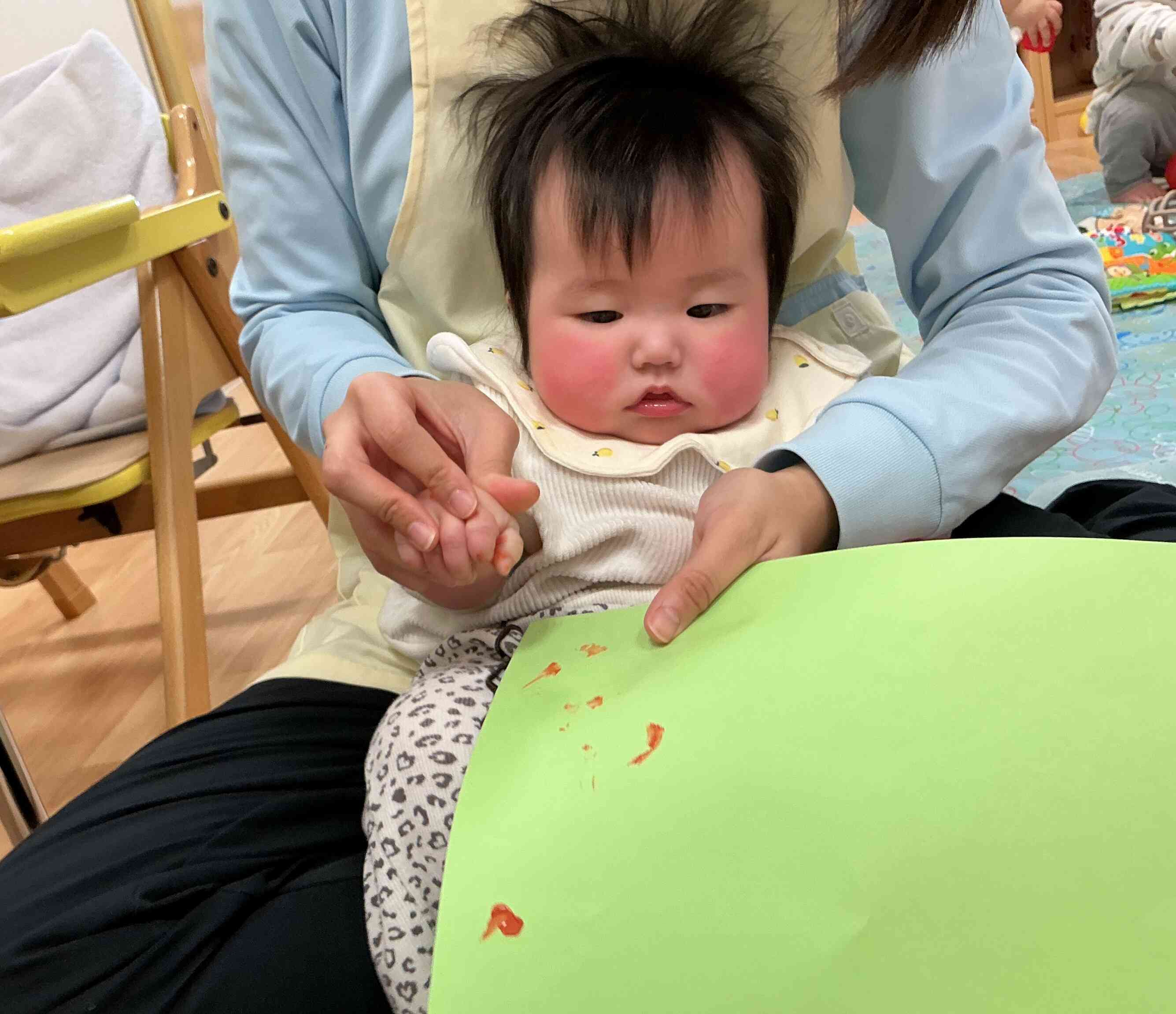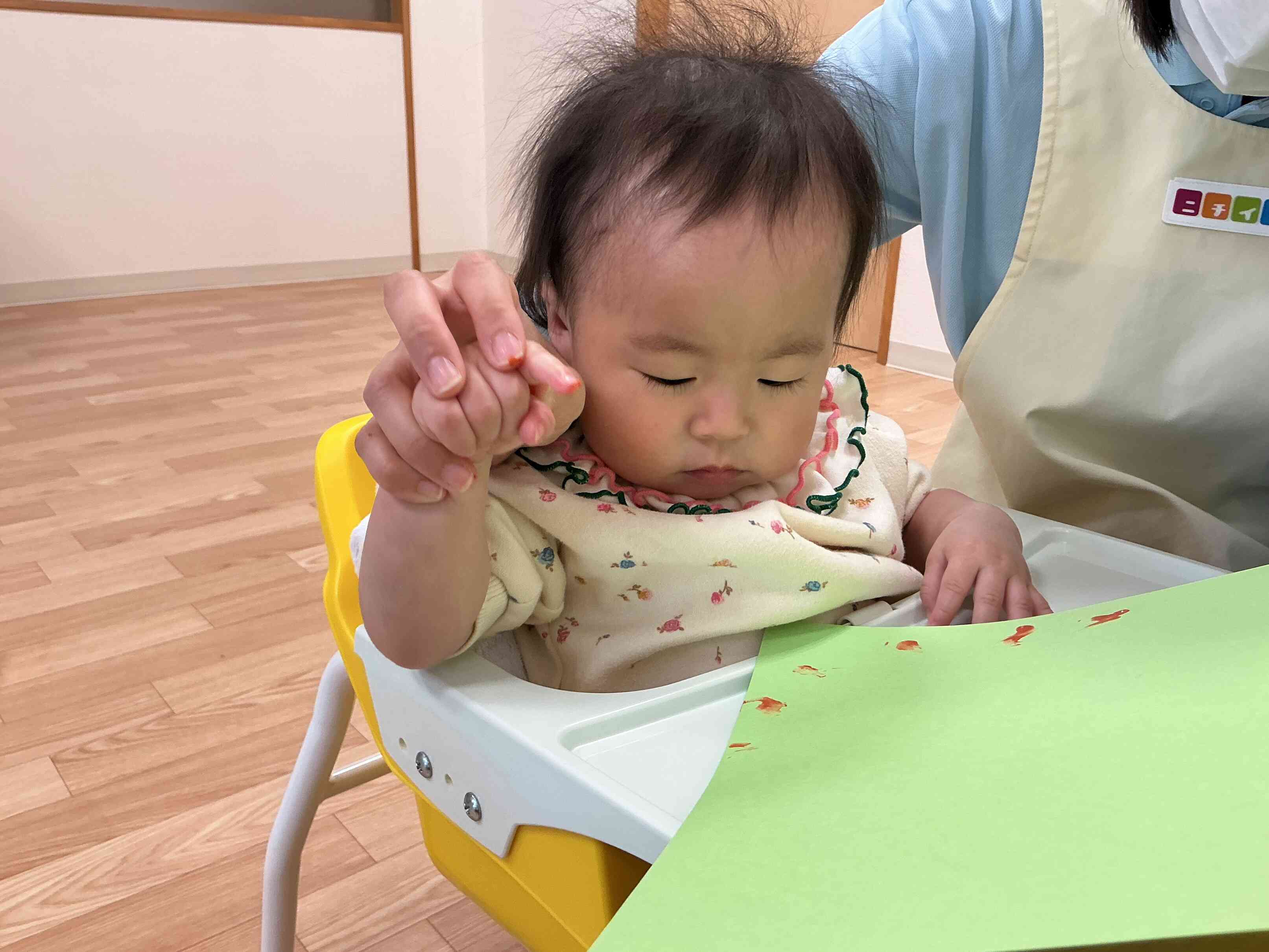 絵具を指につけて、画用紙にぽんぽんと押していきましたよ!(^^)!