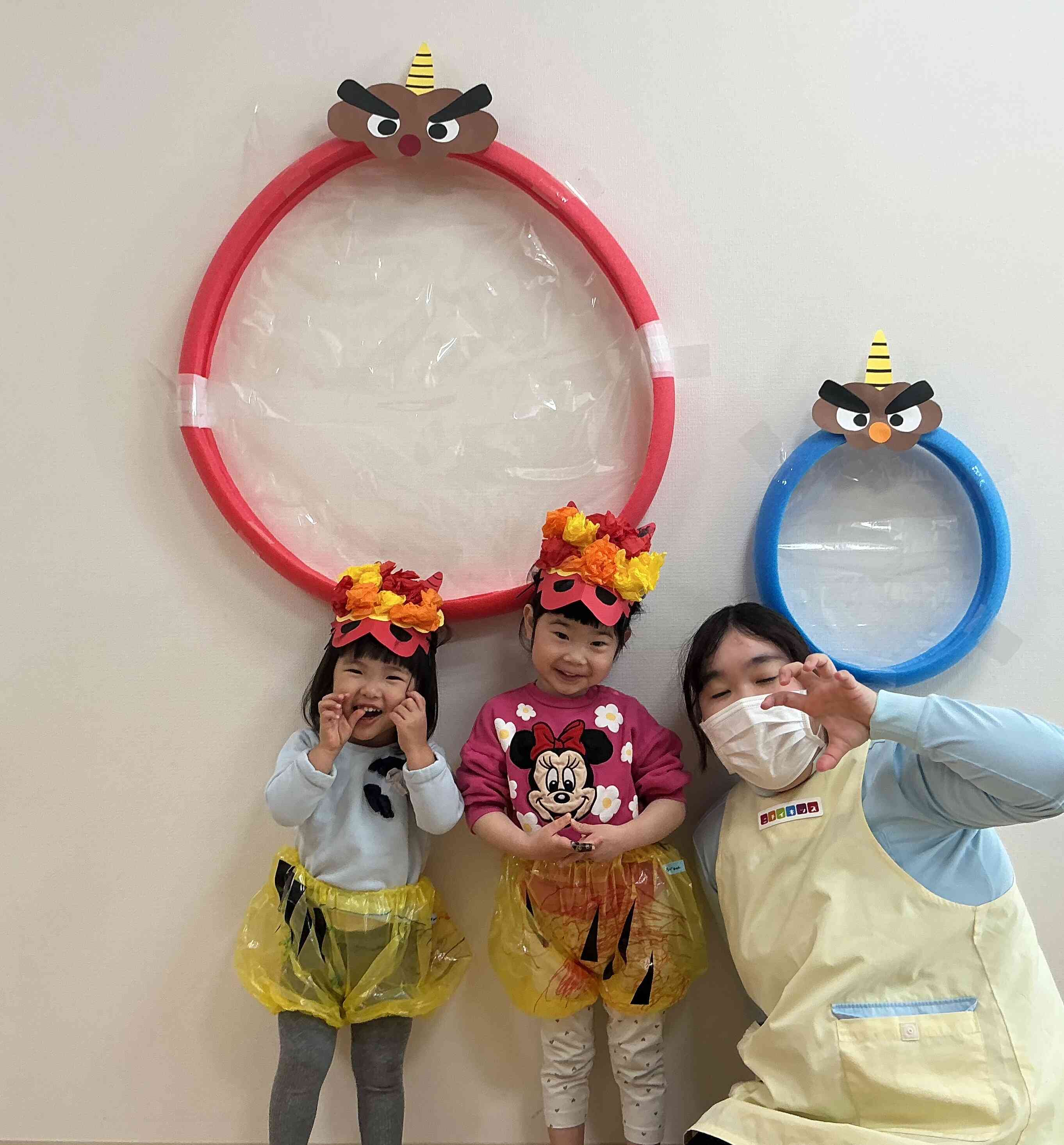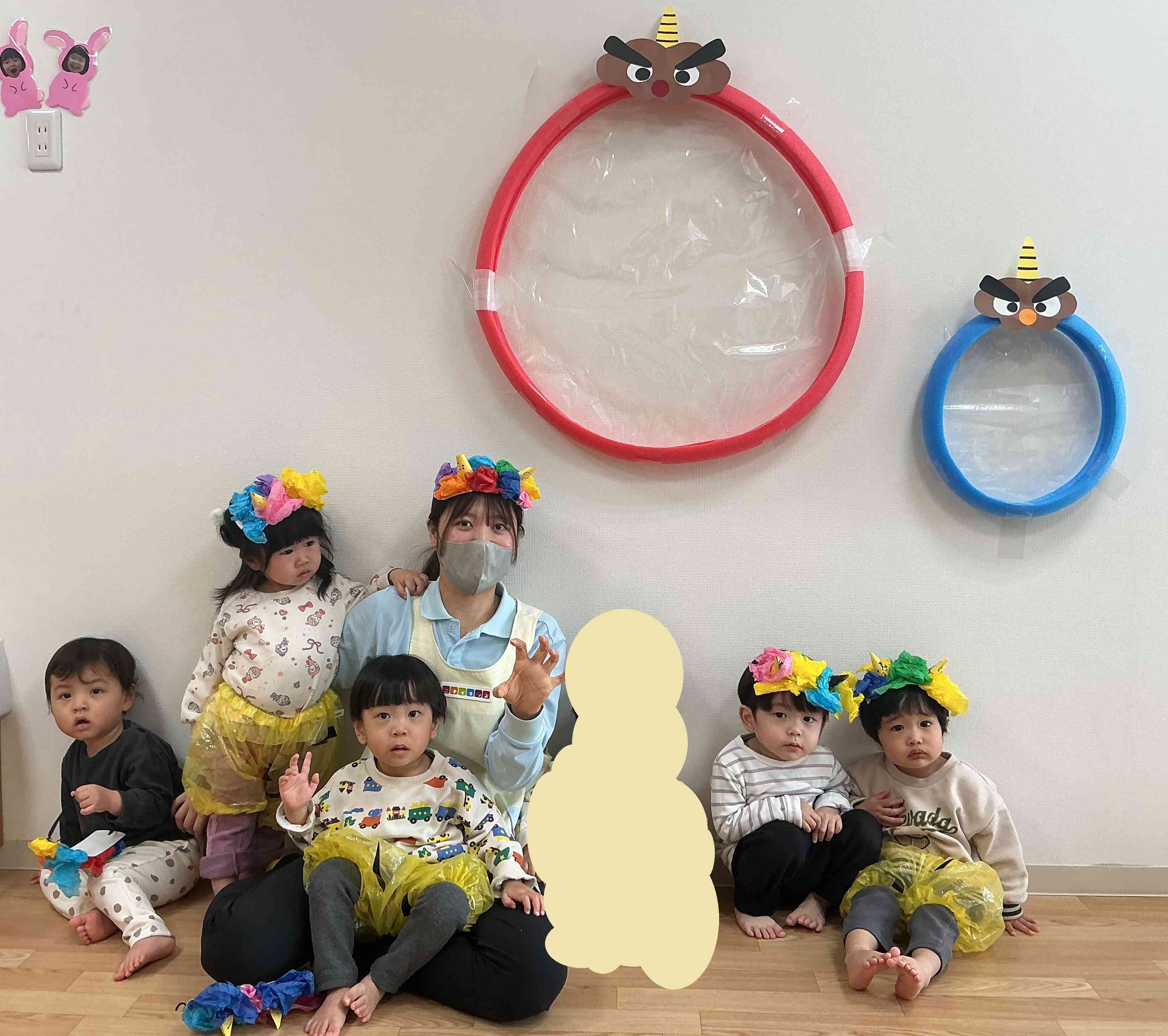自分たちで作ったかっこいい鬼のパンツとカチューシャをつけて鬼さんに変身(^^)/
