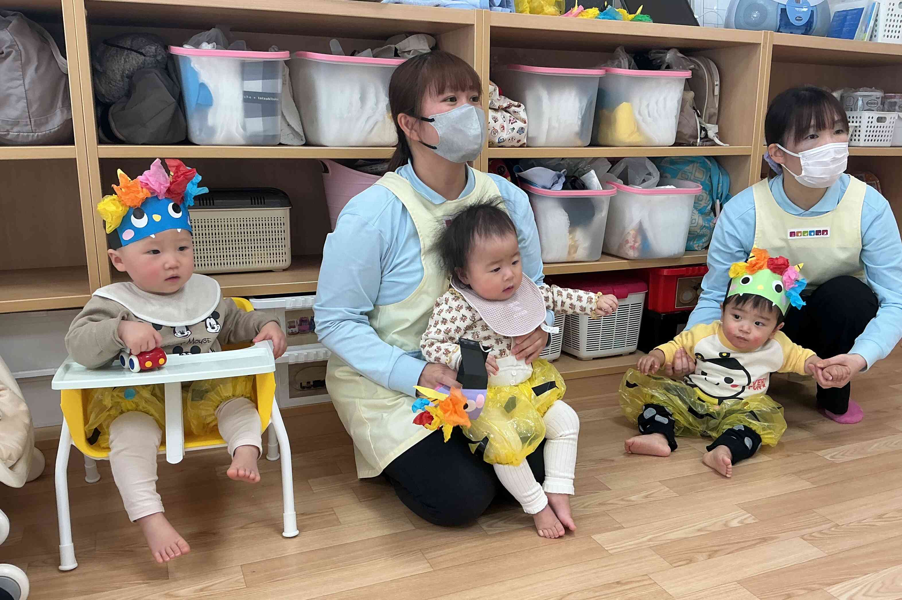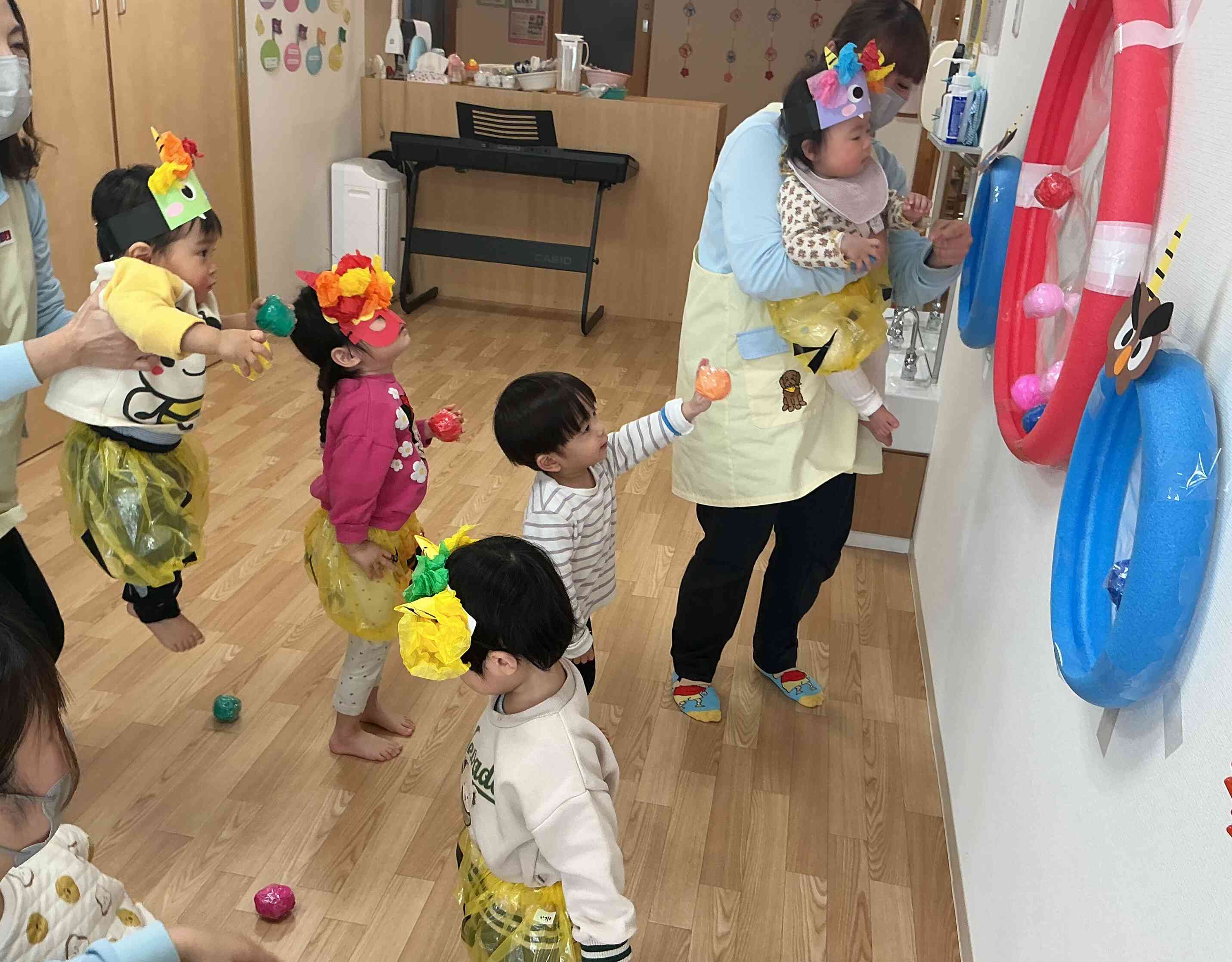 可愛い鬼さんたちが赤鬼・青鬼のお口をねらってボールを投げますよ~(^^)/