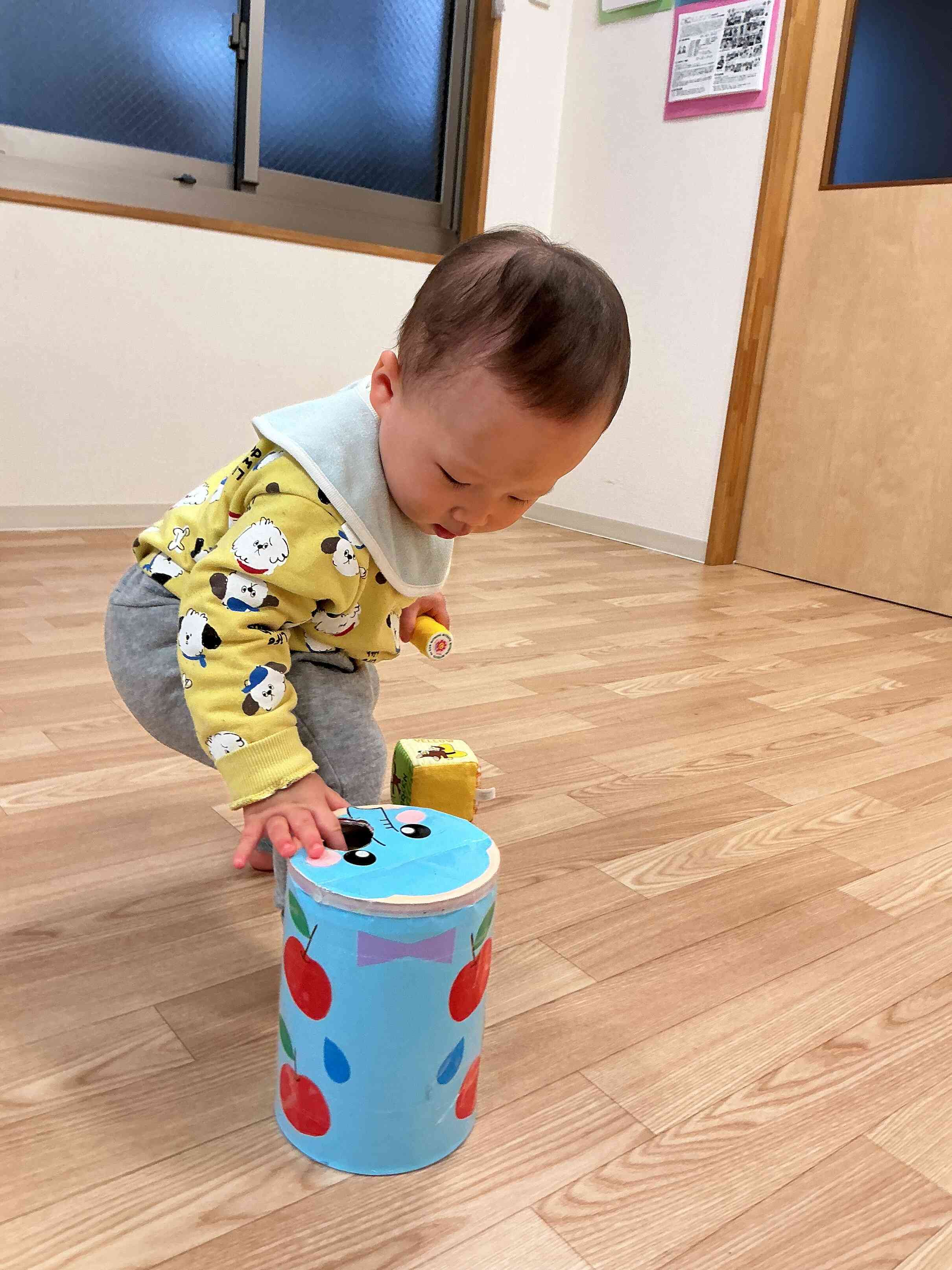 ポットン落としは、手首がうまく使えるようになり、握る離すから、つまんで落とすへと指先を使うことで手指の発達を促します☆