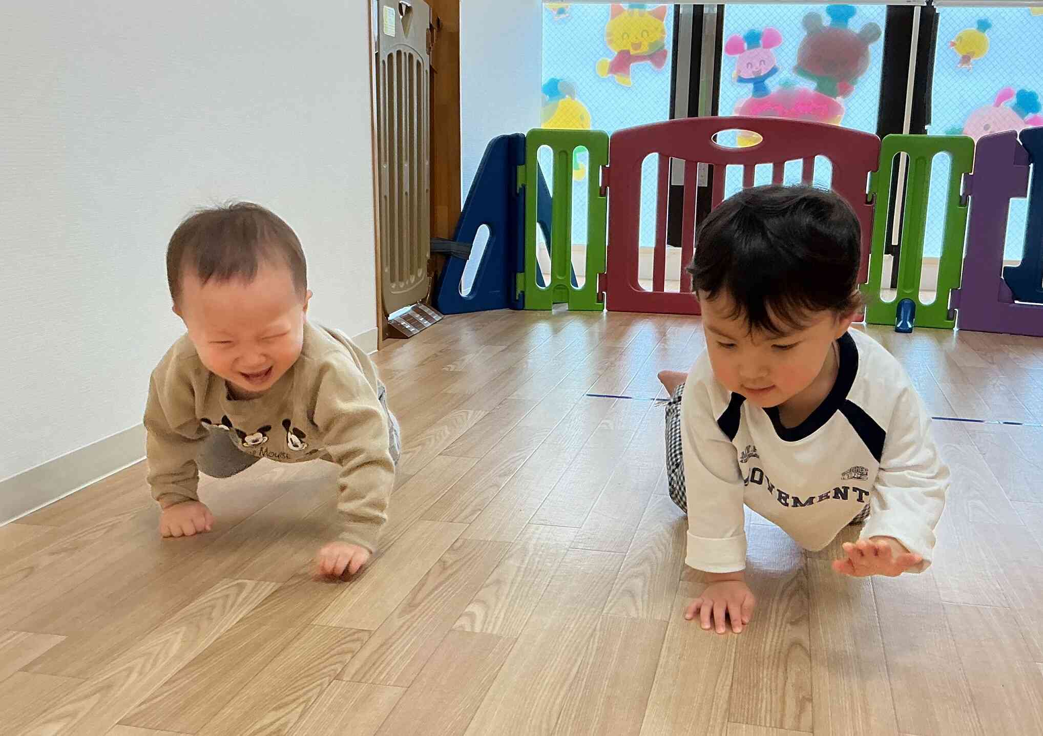 いつの間にか、お兄ちゃんと仲良くハイハイ競争が始まっていました(^^♪