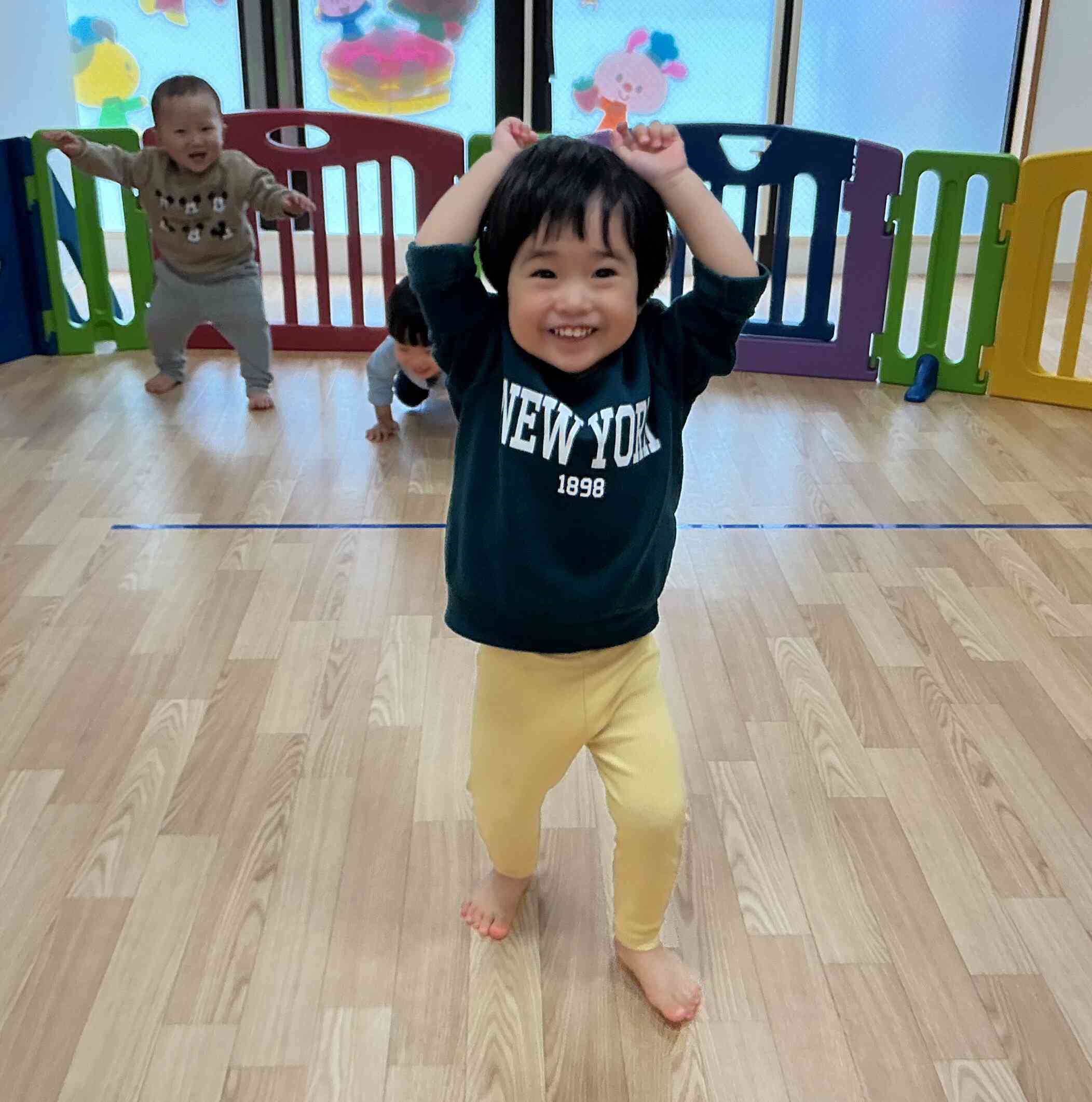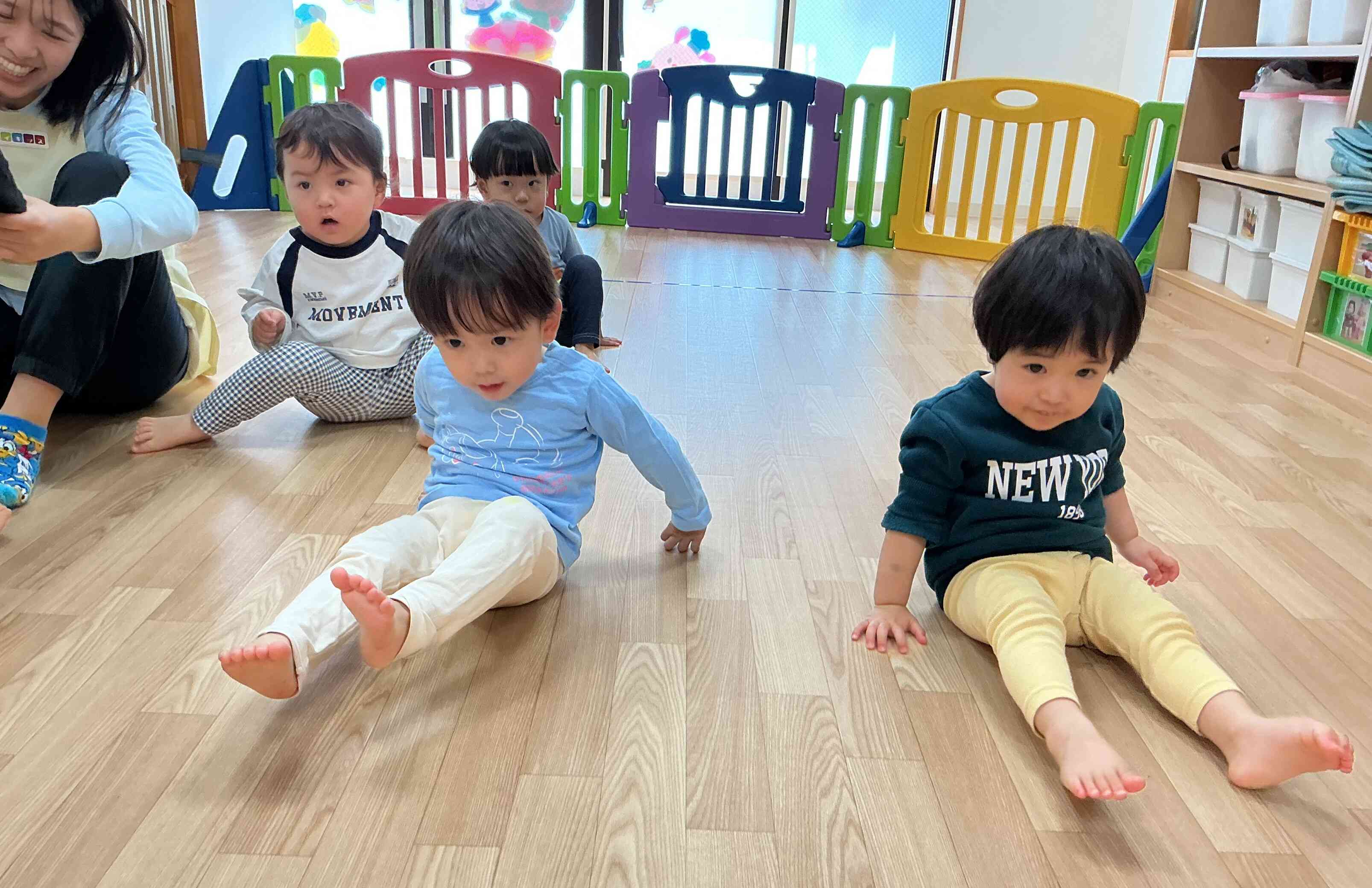 ピアノの音を聞きながら、お尻と手、腹筋を使って前に進むことに挑戦‼