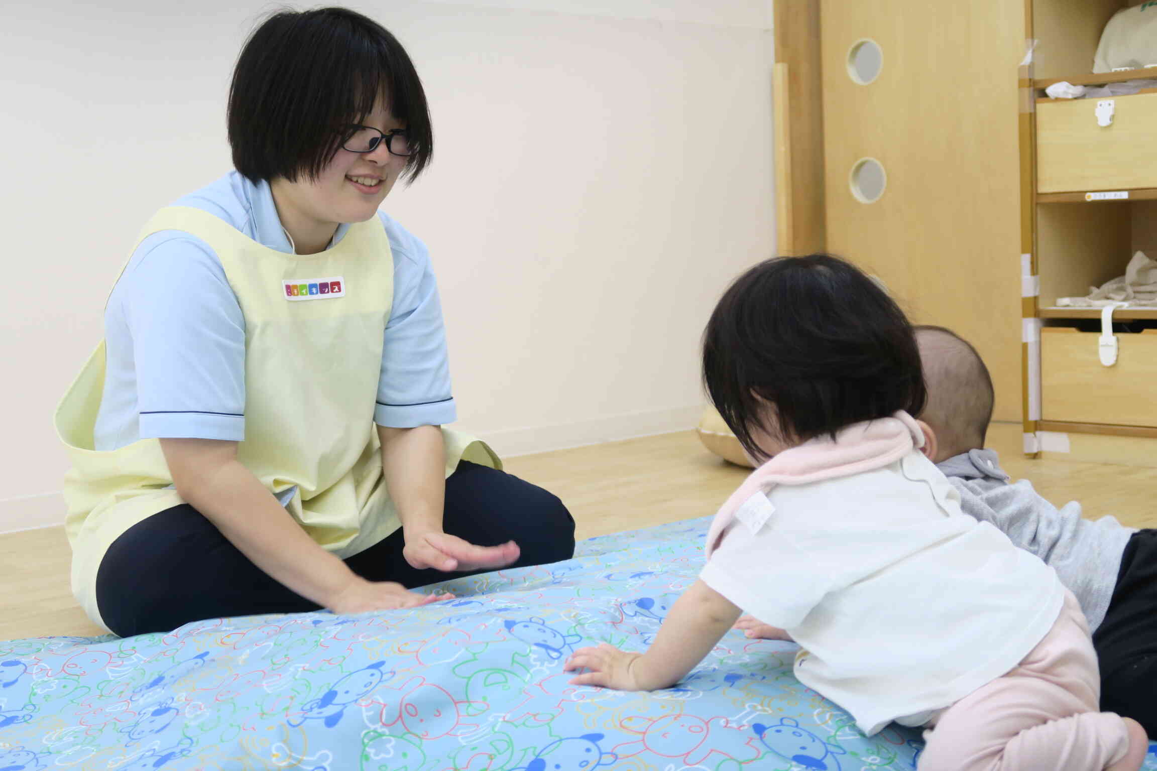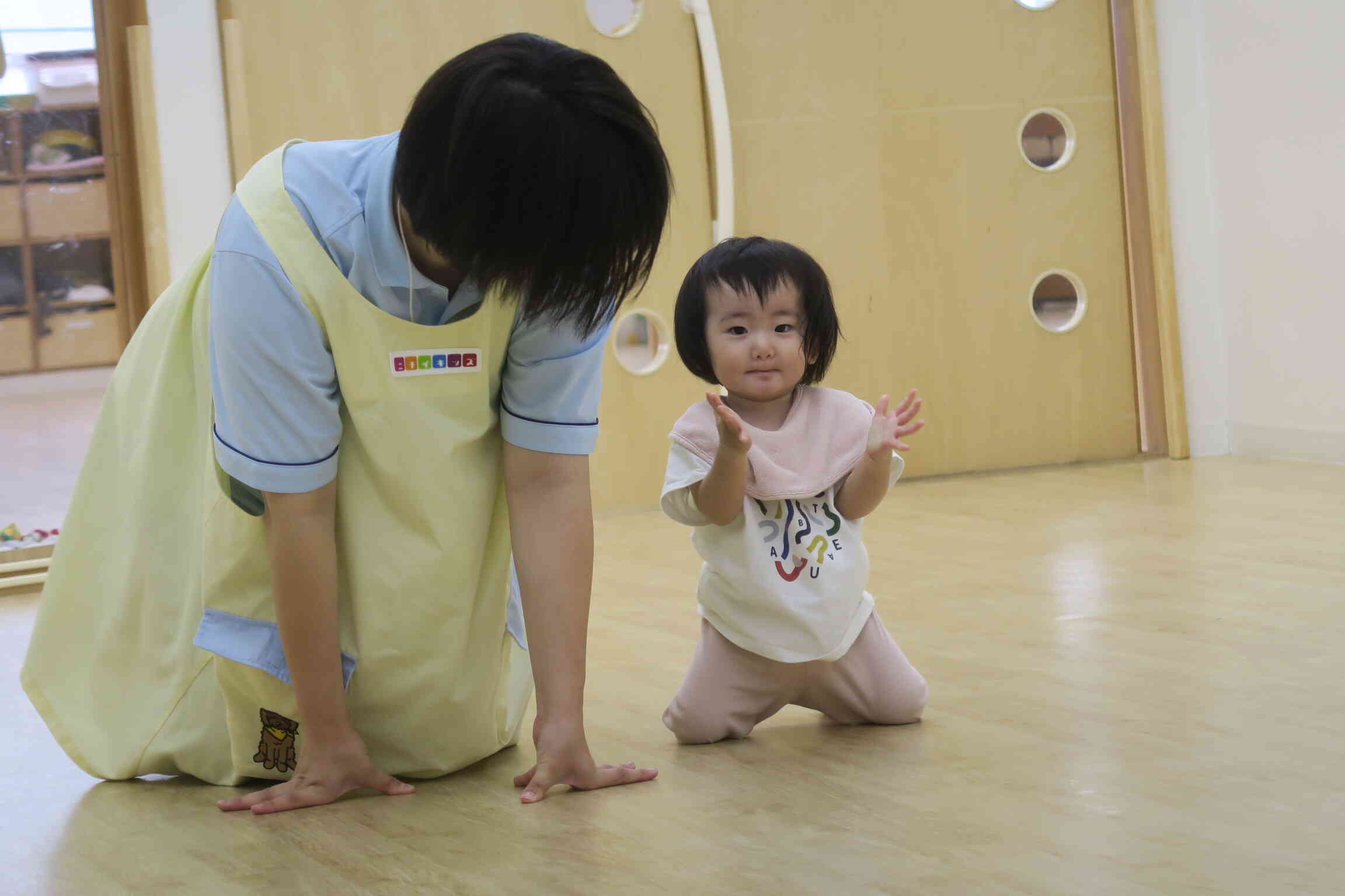 広い保育室内はハイハイで探索活動をしたり、お布団の山を登ったり下りたり・・・