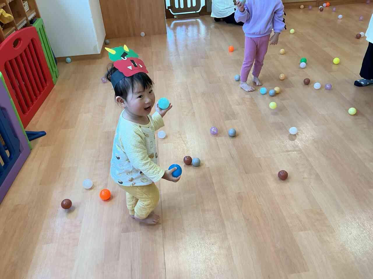 カラーポリでできたカラフルなオニをみんなで豆まきして鬼退治!!