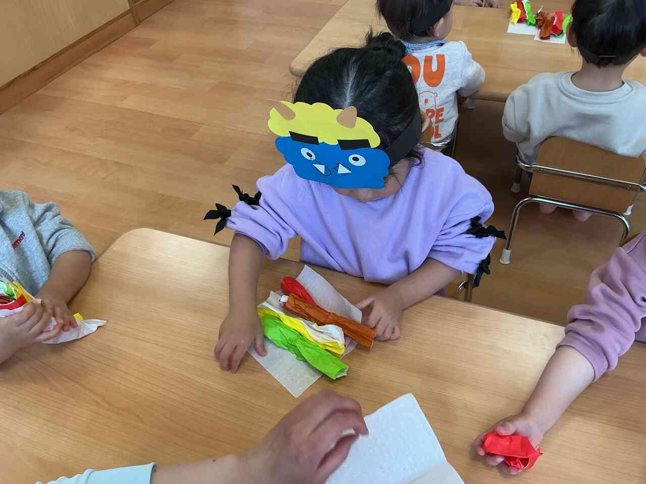 先日作った可愛いオニのお面をつけて、節分の行事に参加しました。