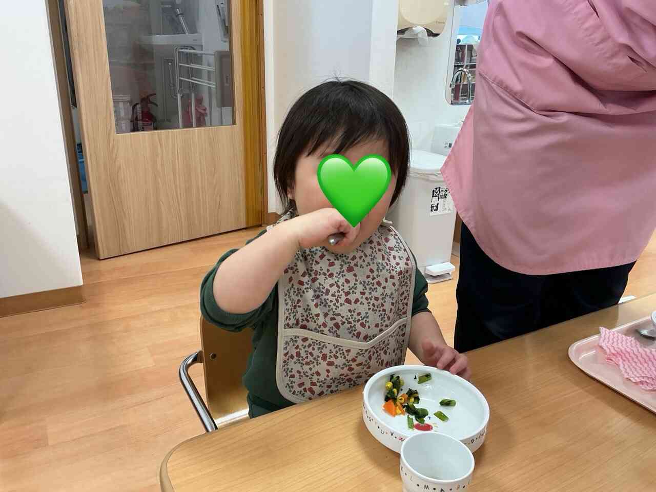 うさぎ組さんもスプーンで上手に食べられるようになったね。