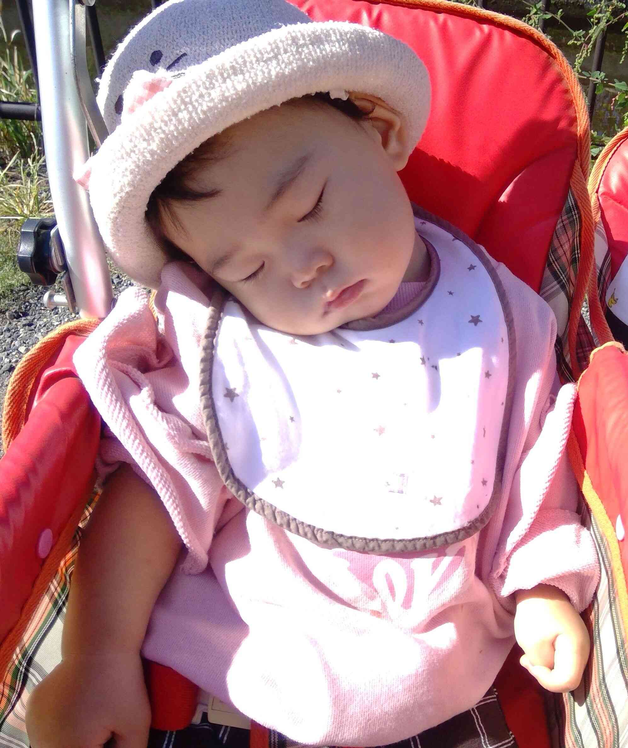 公園に行ってたくさんハイハイをして遊んだので、帰りのバギーでうとうと・・・。