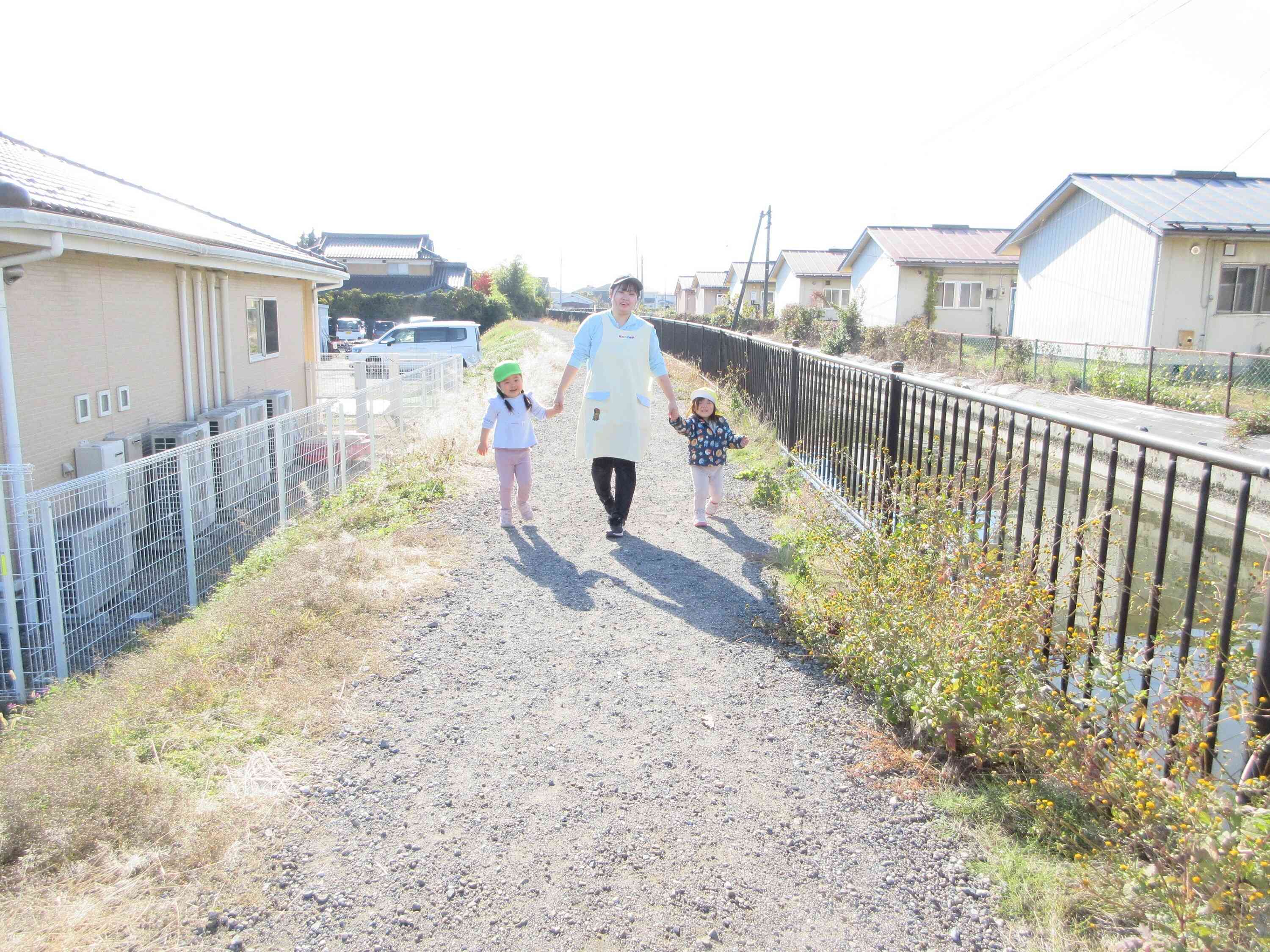 こちらのお友だちは、大好きな先生と一緒にお歌をうたいながら歩いています。