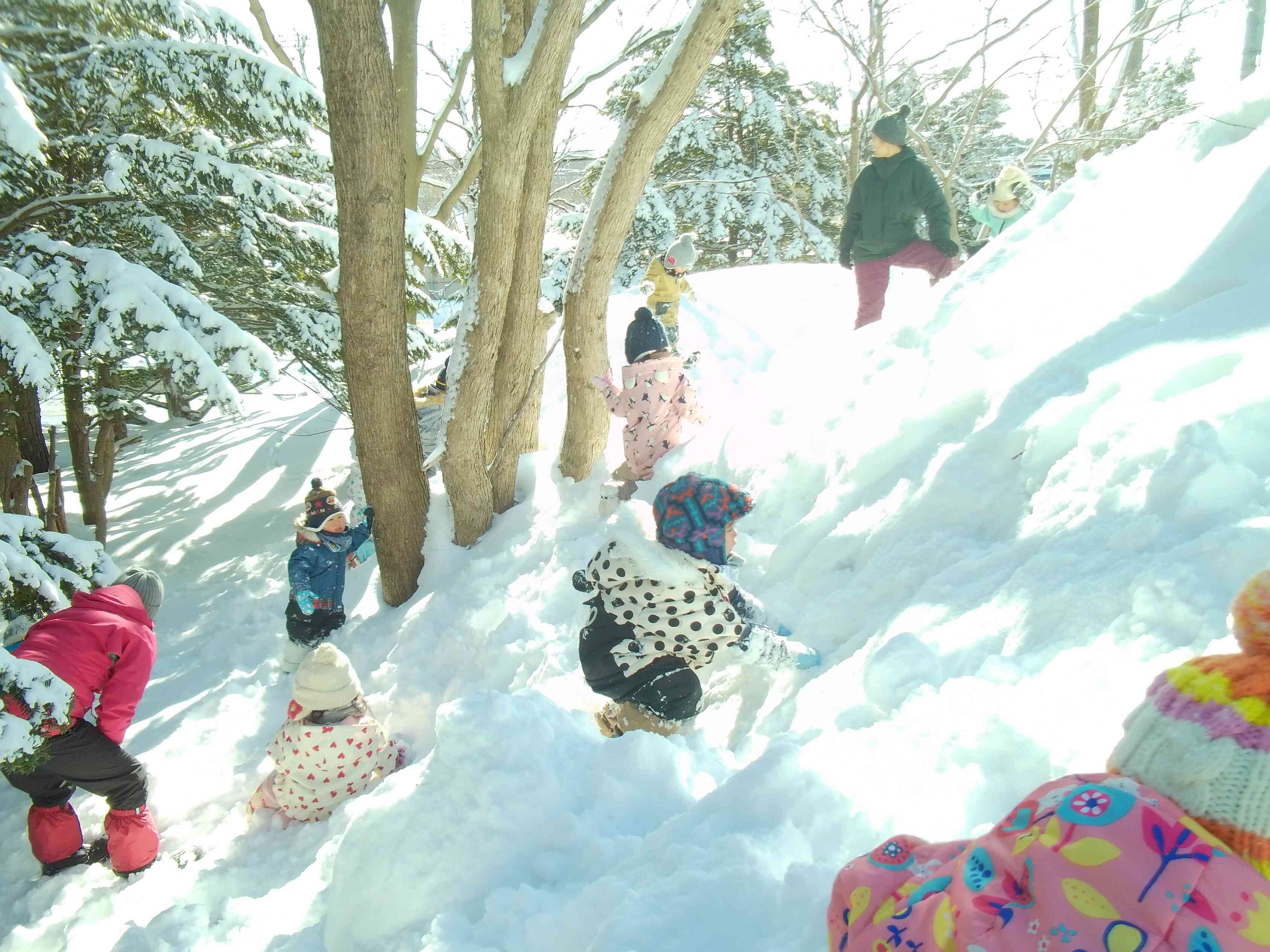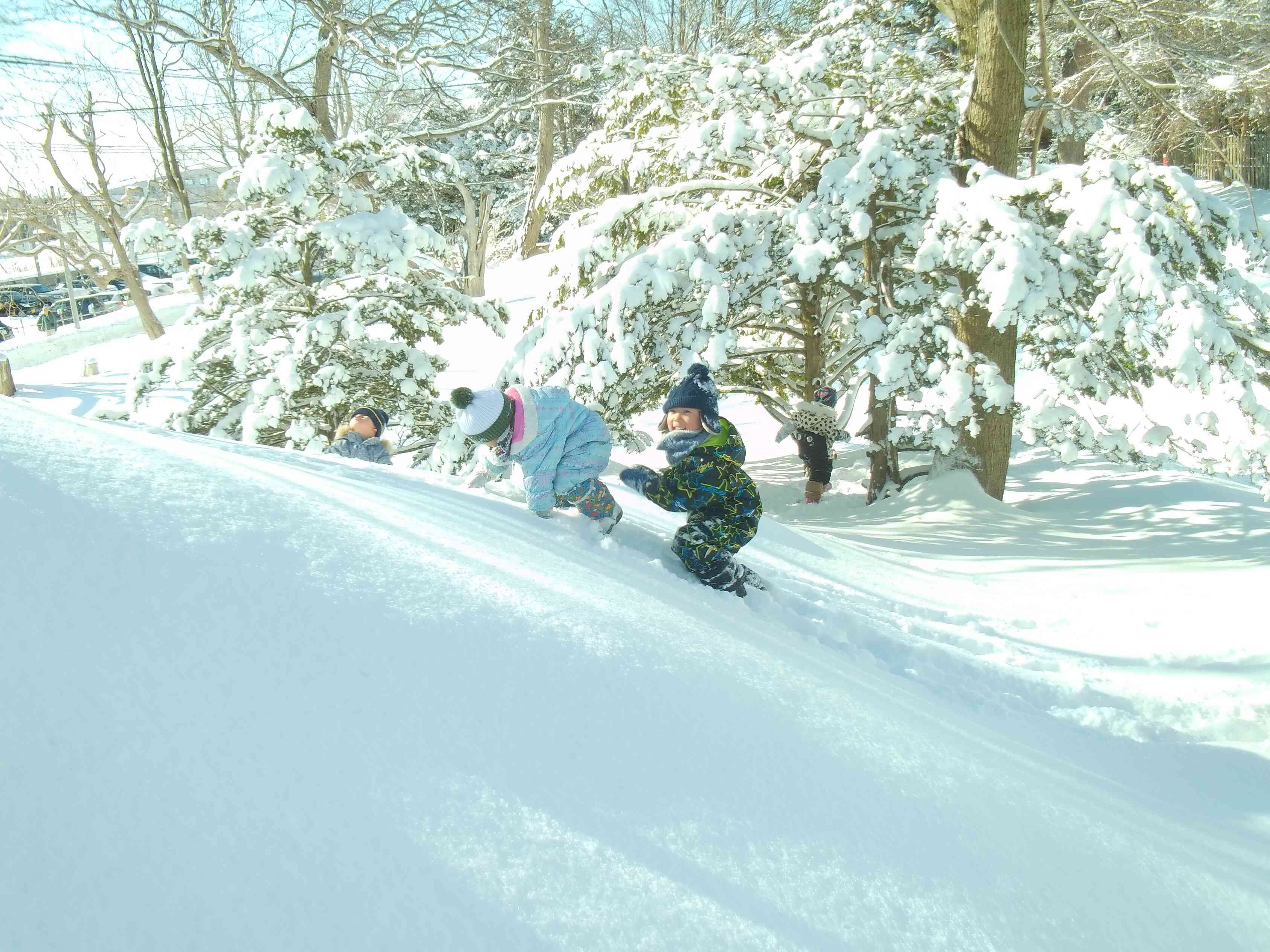 登ったら、滑る、、滑ったら、登る、、毎日汗だくになって楽しんでいる1,2歳児クラスの子ども達です♪(保育士も汗だくです!!)