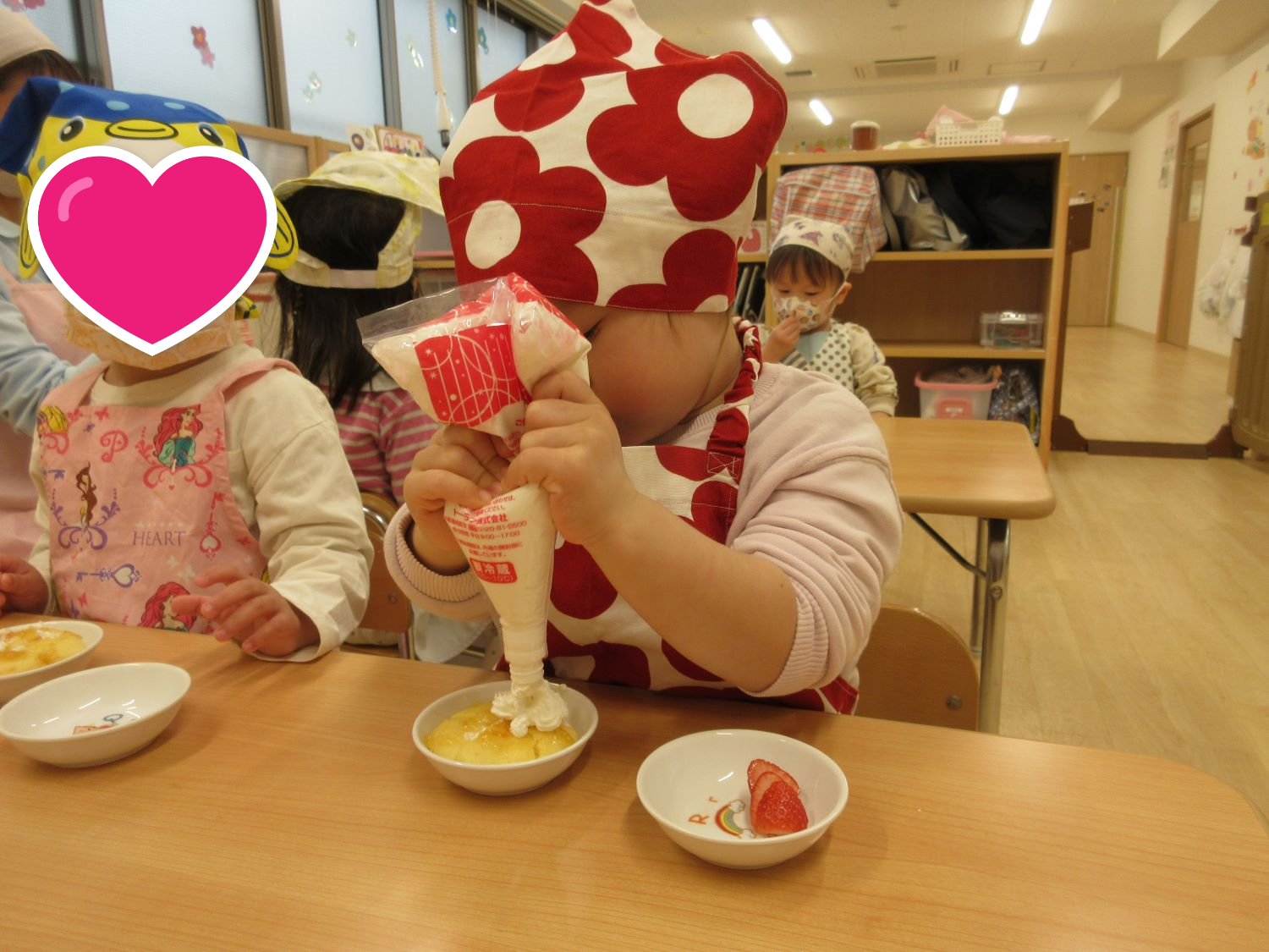 作り方の説明を聞き、園児それぞれがスポンジにクリームを絞り、いちごを乗せ