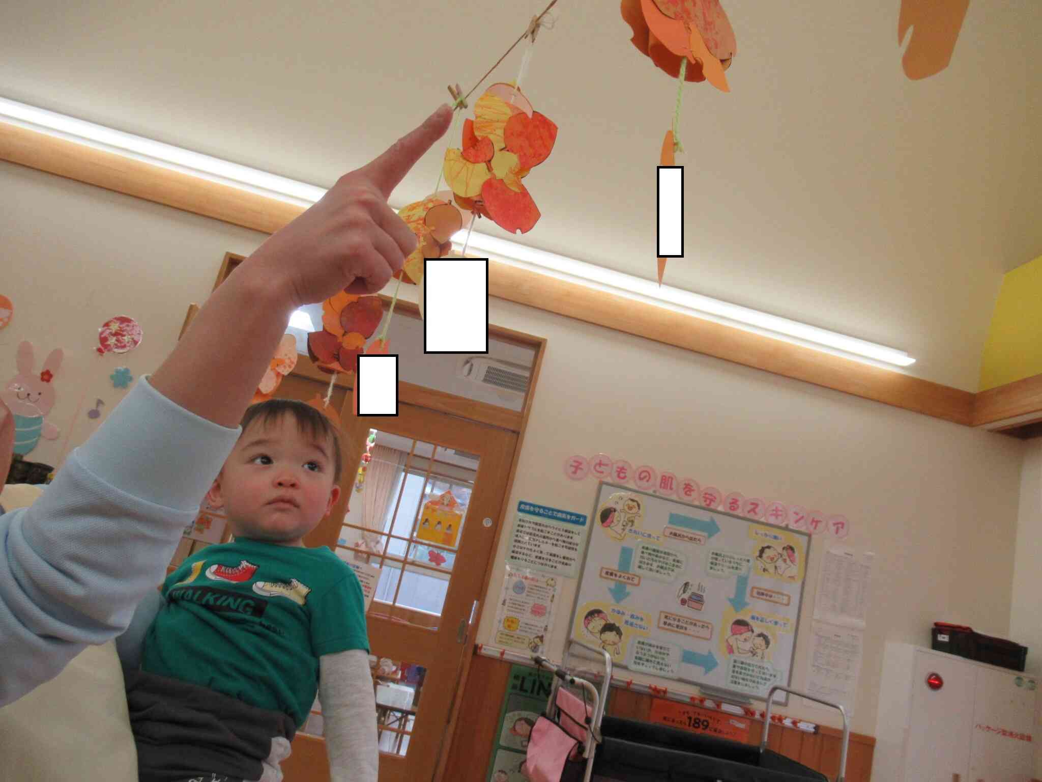絵具スタンプを指先を上手に使ってポンポンしたり、クレヨンで模様を描いて落ち葉作り♪可愛いミノムシが出来ました!皆で自分の作ったミノムシを嬉しそうに眺めていましたよ。