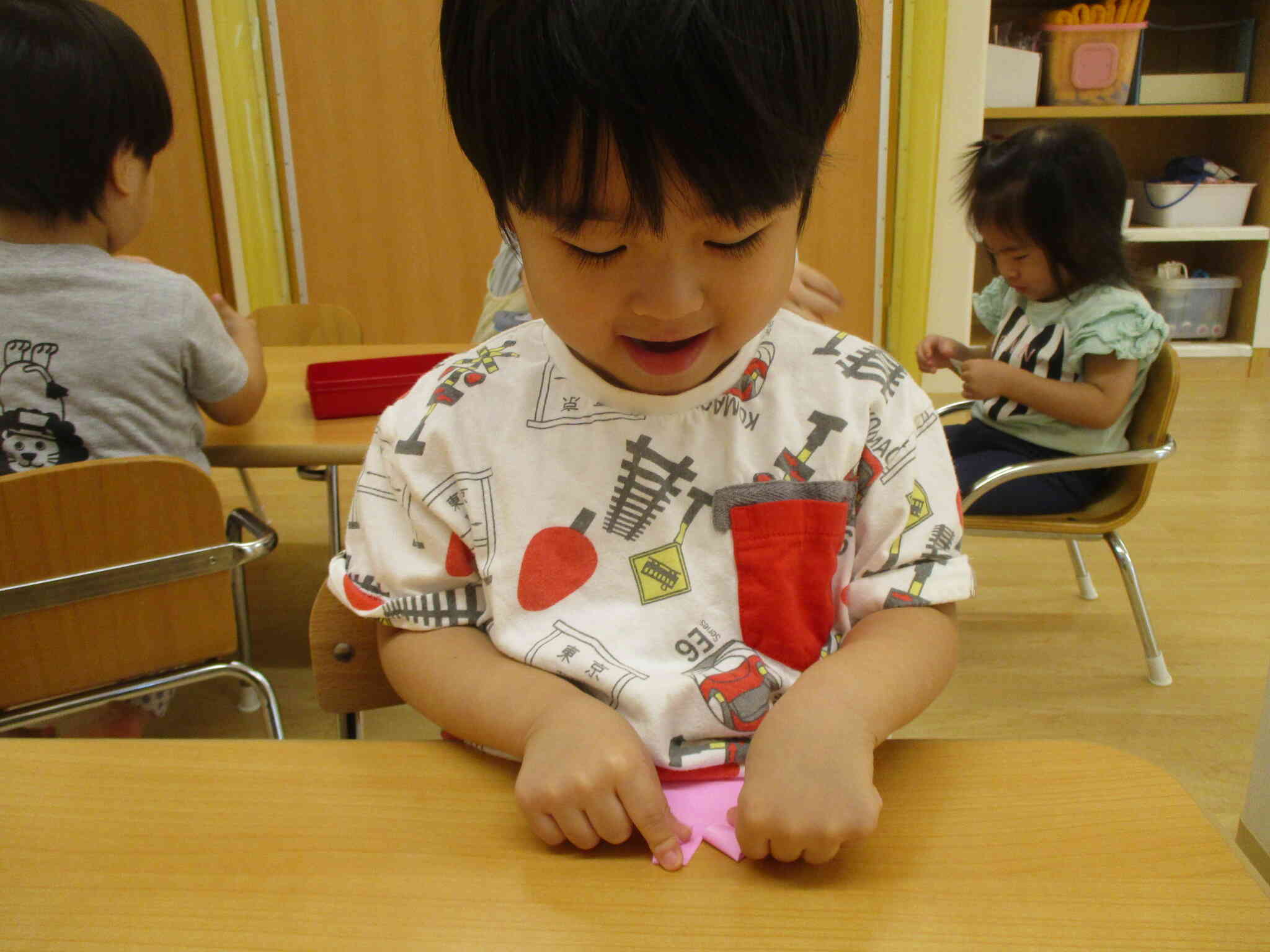 2歳児うさぎ組さんは折り紙で作ったうさぎに自分たちでお顔を描きましたよ。
