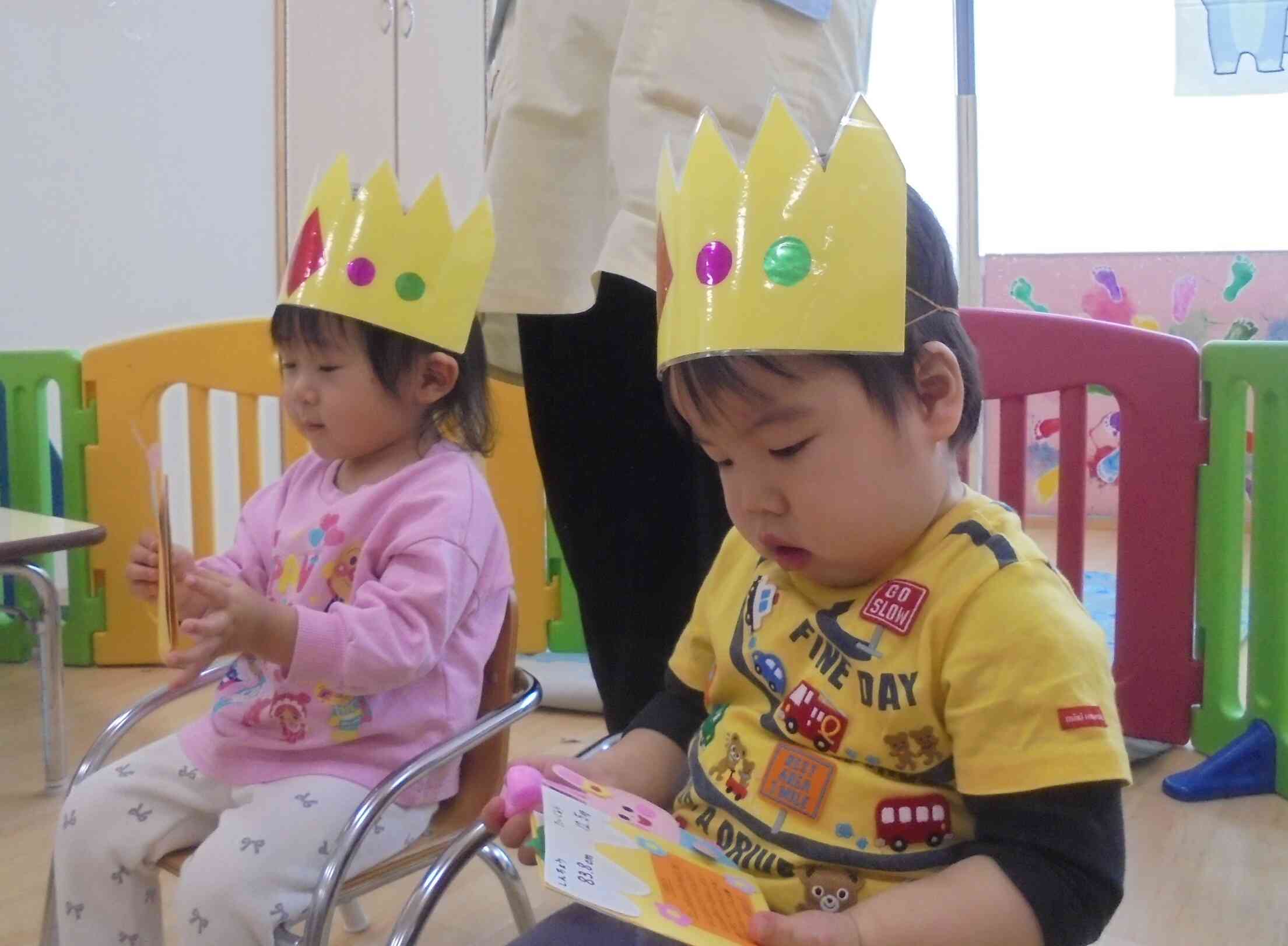 冠をかぶって、先生たちからのメッセージカードを受け取ります。