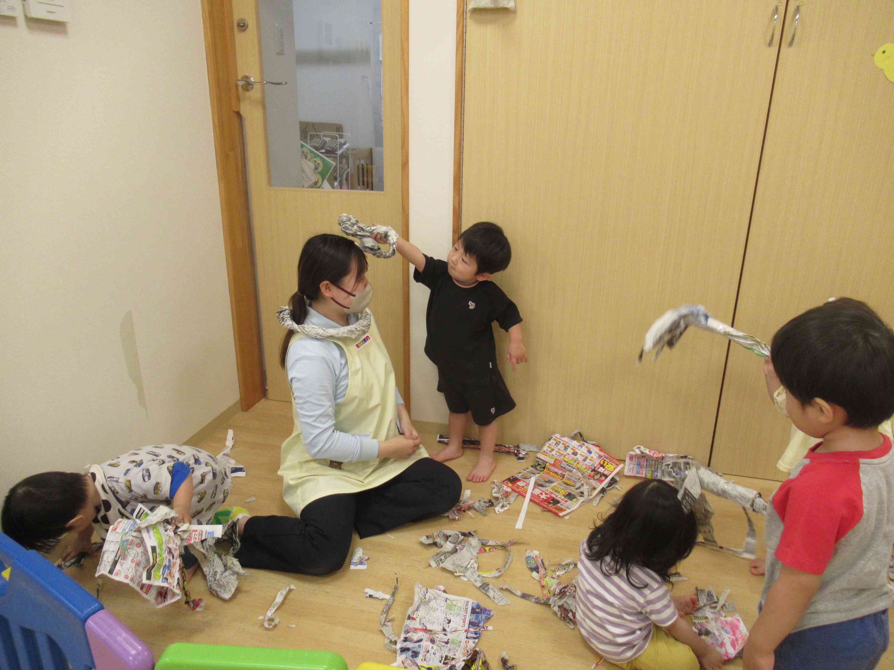 新聞紙遊びをしました。うさぎ組・あひる組さんは新聞紙をビリビリしたり、新聞紙の紙吹雪を作って遊んだよ!