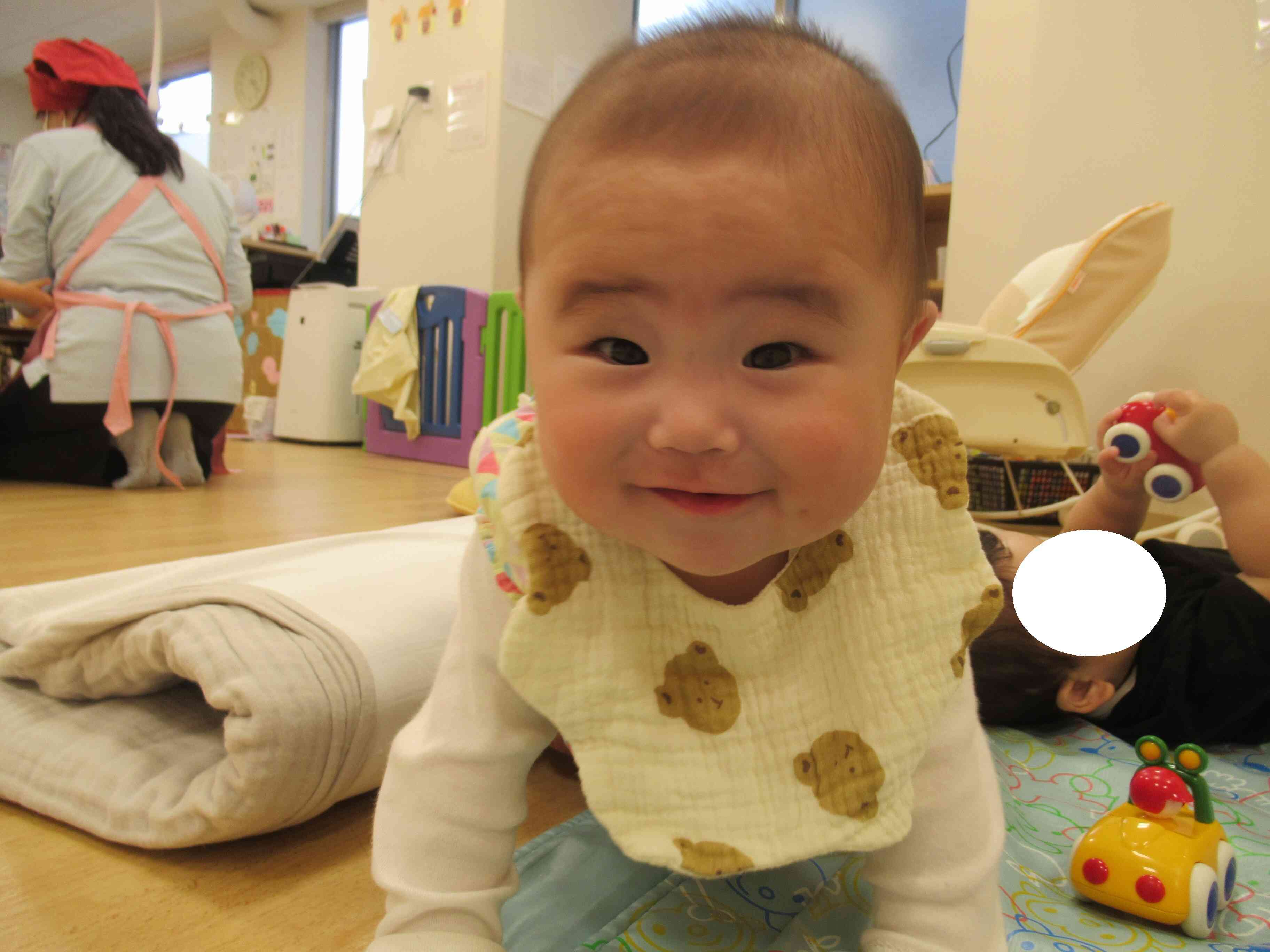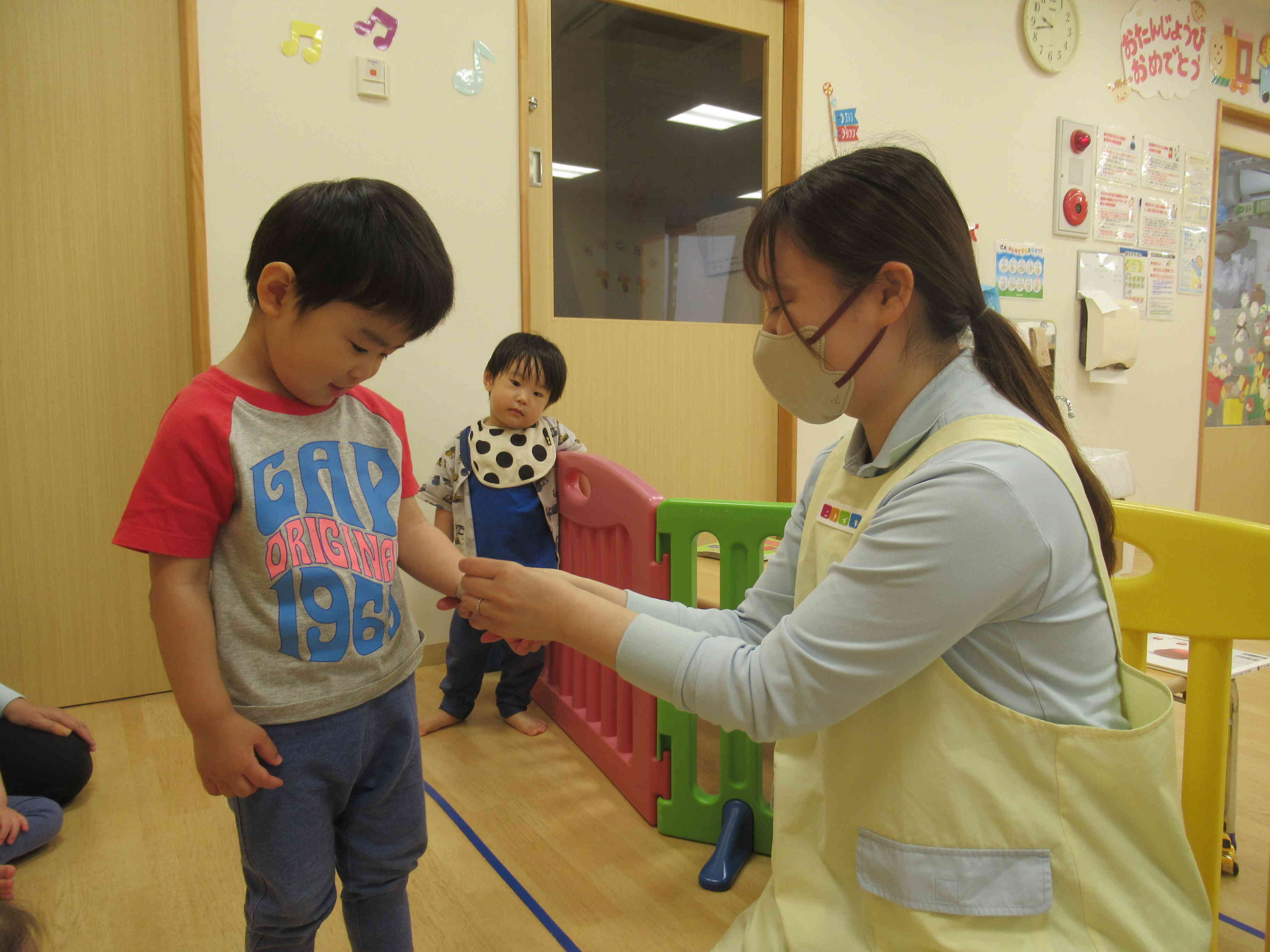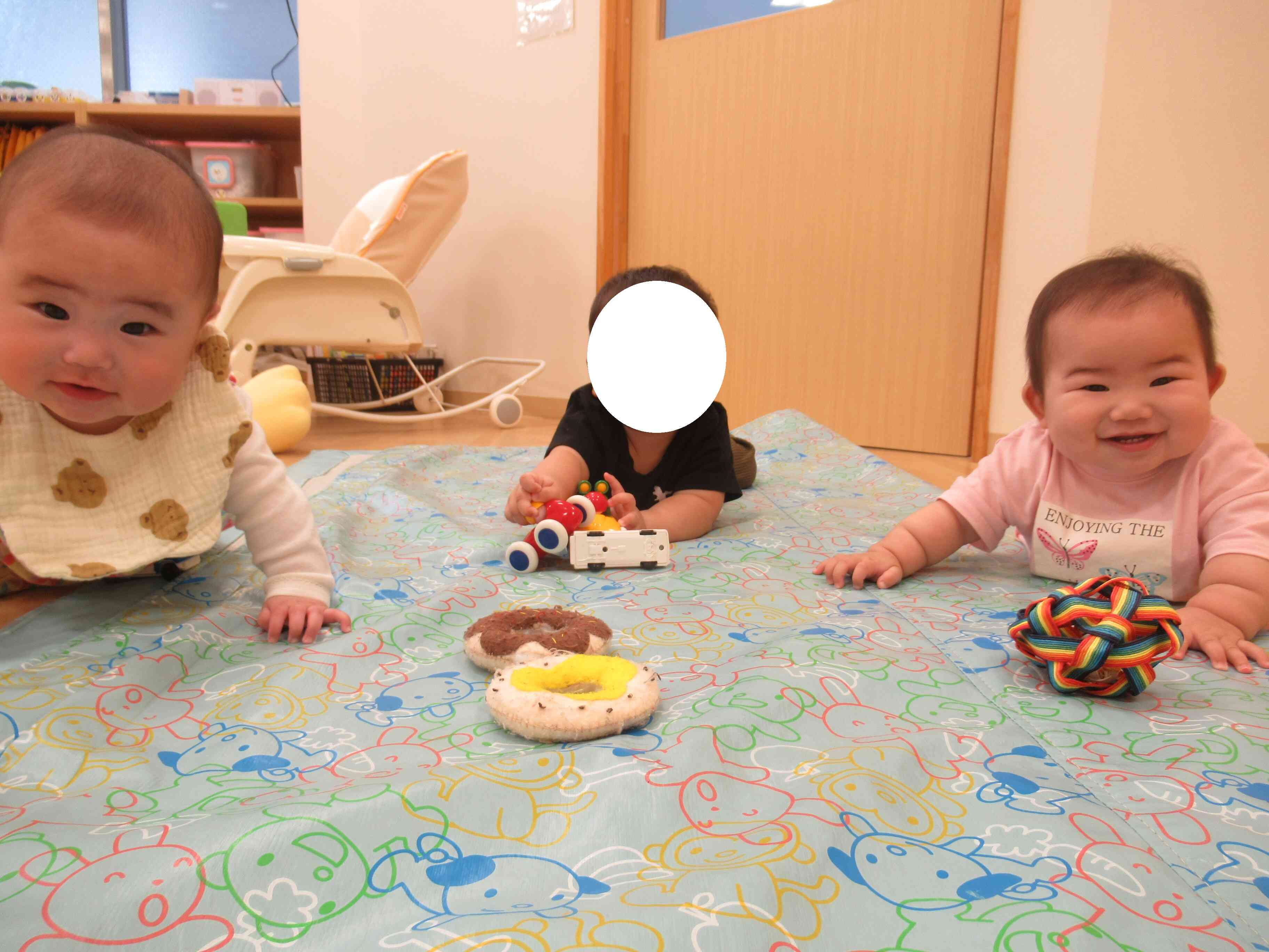 ひよこ組さんも一緒に新聞紙をさわってみたよ。カシャカシャなる音に不思議そうにしていましたが、実際、手に取って感触を確かめていました。新聞紙に興味津々で自分から手をのばして、上手に両手で掴むことができました。
