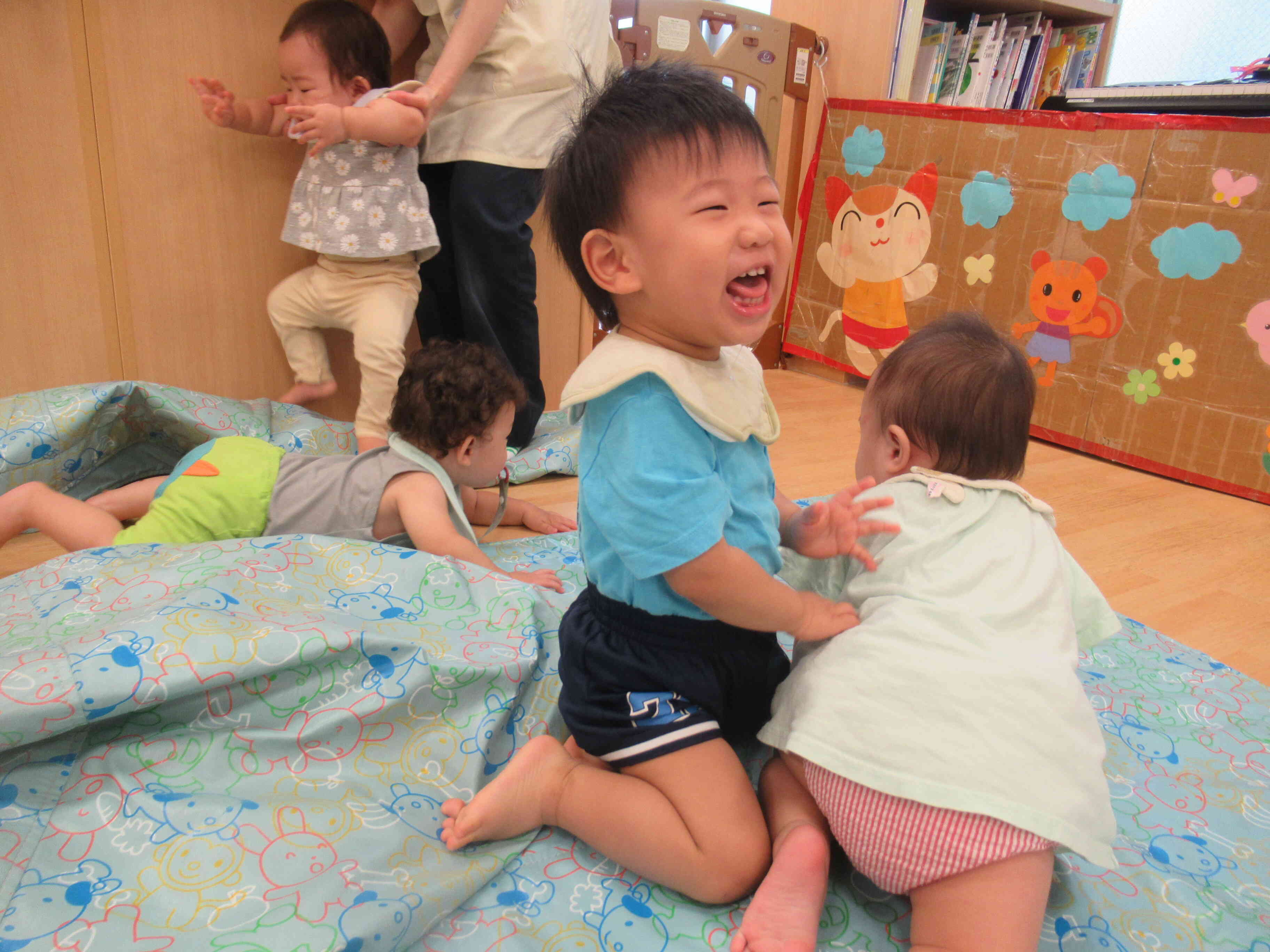 他にもマットで出来たデコボコ道を通って、ハイハイレース競争をしました。