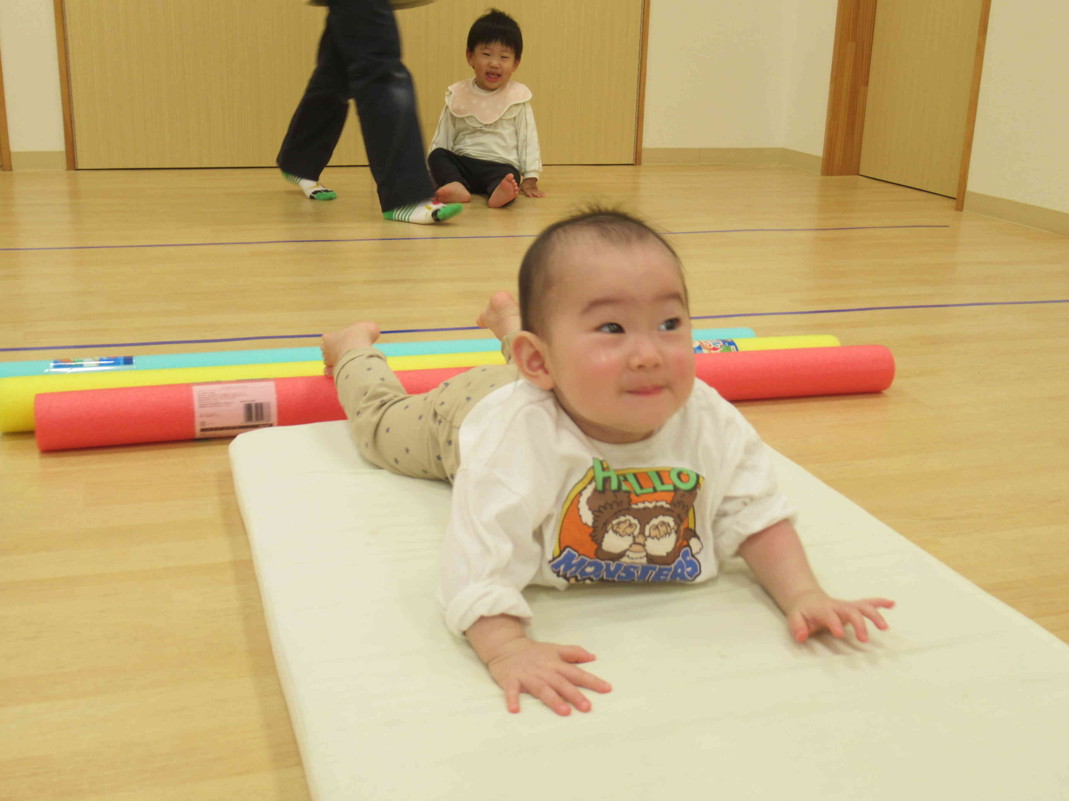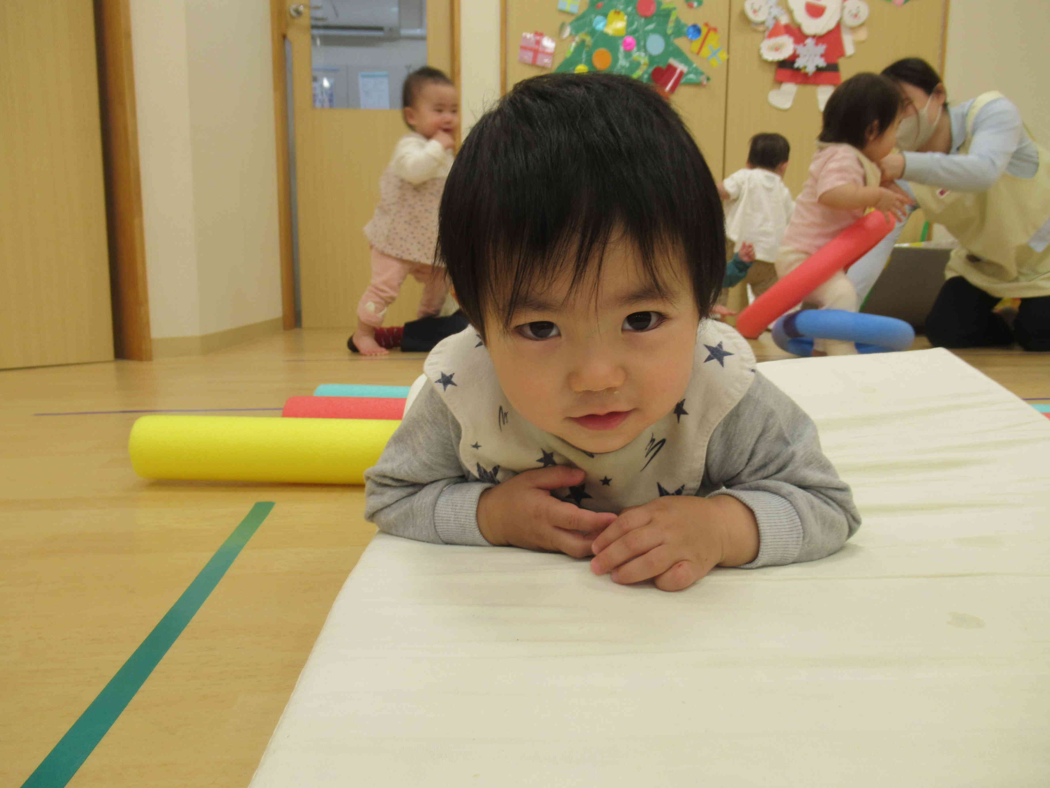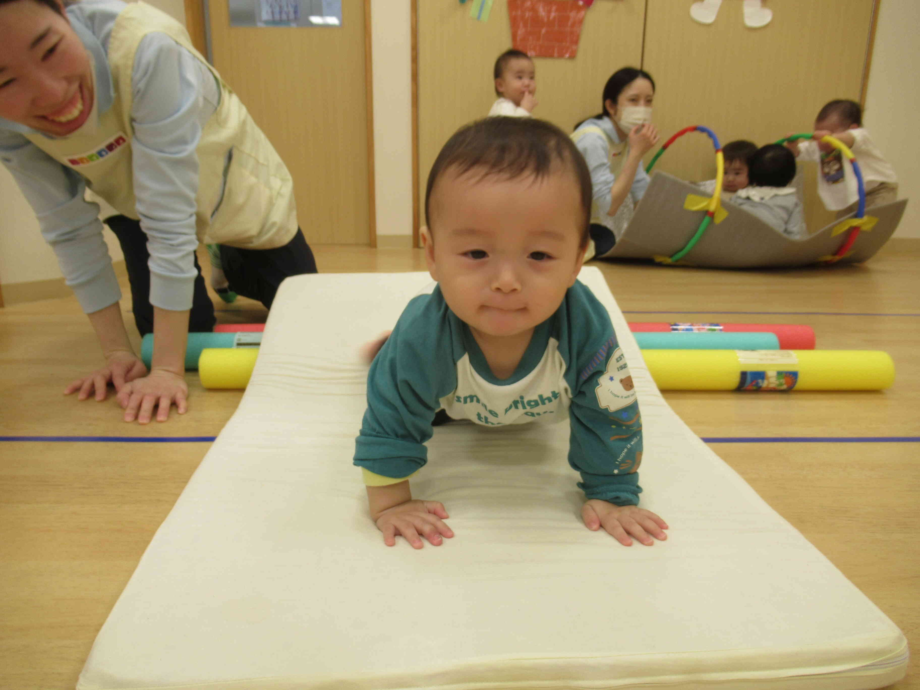 ハイハイで輪っかをくぐってみたり、障害物をのぼって、おりていっぱい体を動かしました。
