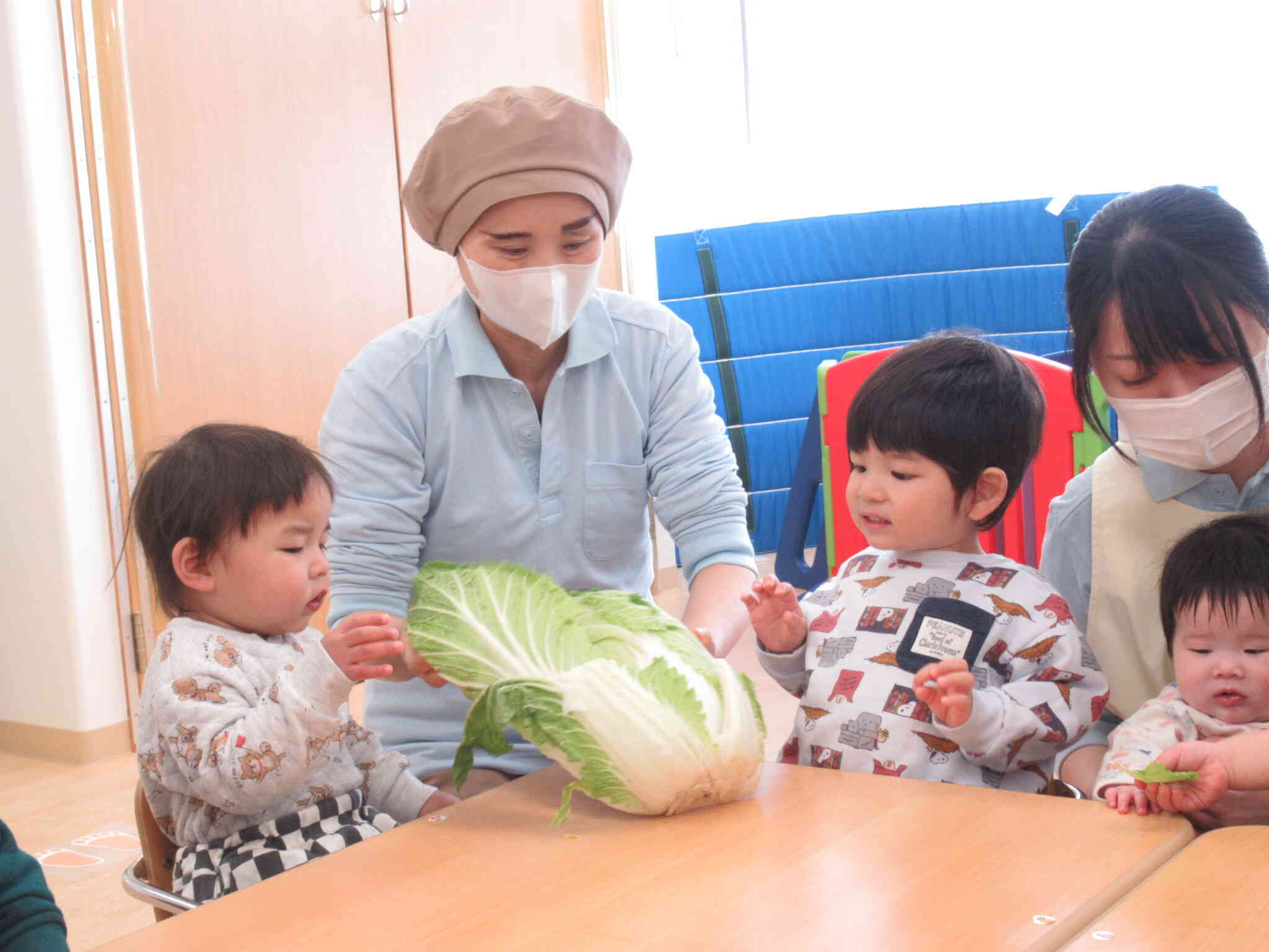 「こんなにおおきな白菜があるよ~」の栄養士のせんせいの声にくぎづけの子ども達(*^^*)