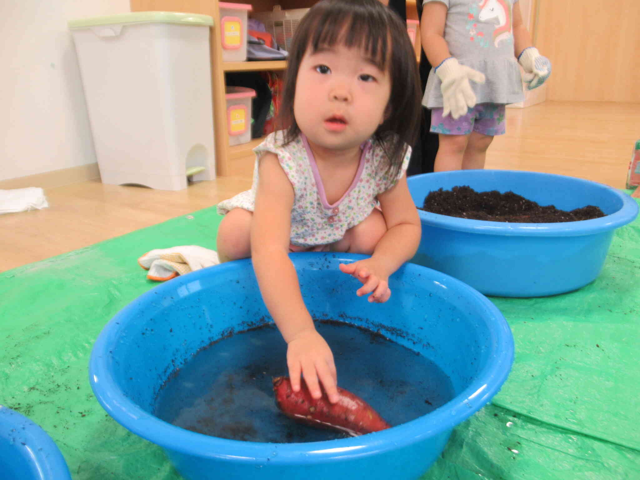 お芋を土の中に隠して、子どもたちが掘り出せるようにしました。