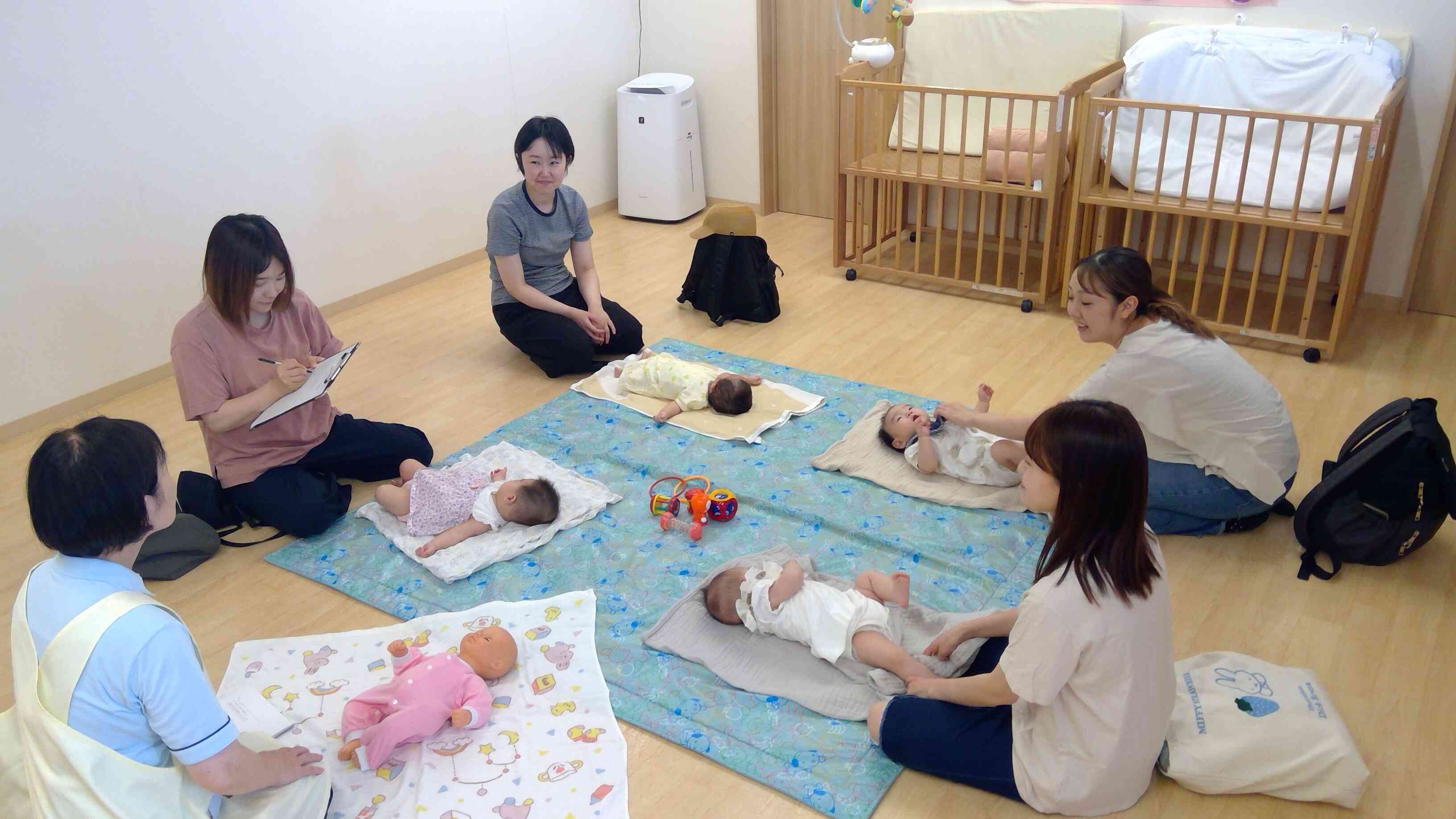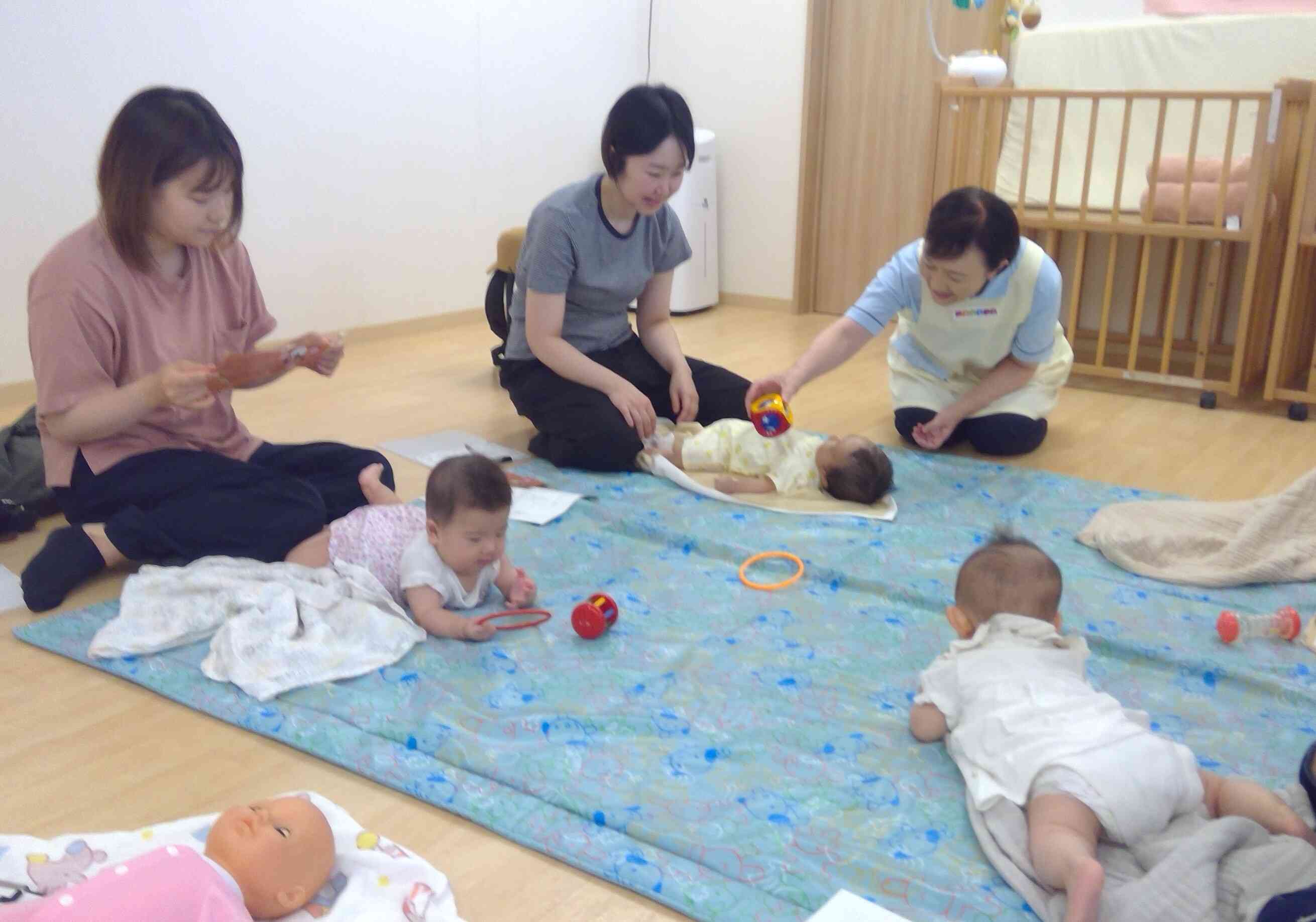 さあ、これからベビーマッサージが始まります。園長先生からのベビーマッサージの説明を受けた後に、ゆっくりと丁寧に親子のスキンシップの時間がスタートしました。