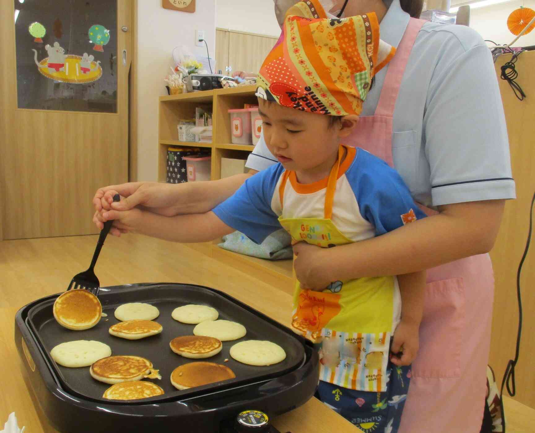 少しして片面が焼けると、フライ返しを使ってひっくり返すことにも子ども達は挑戦しました。