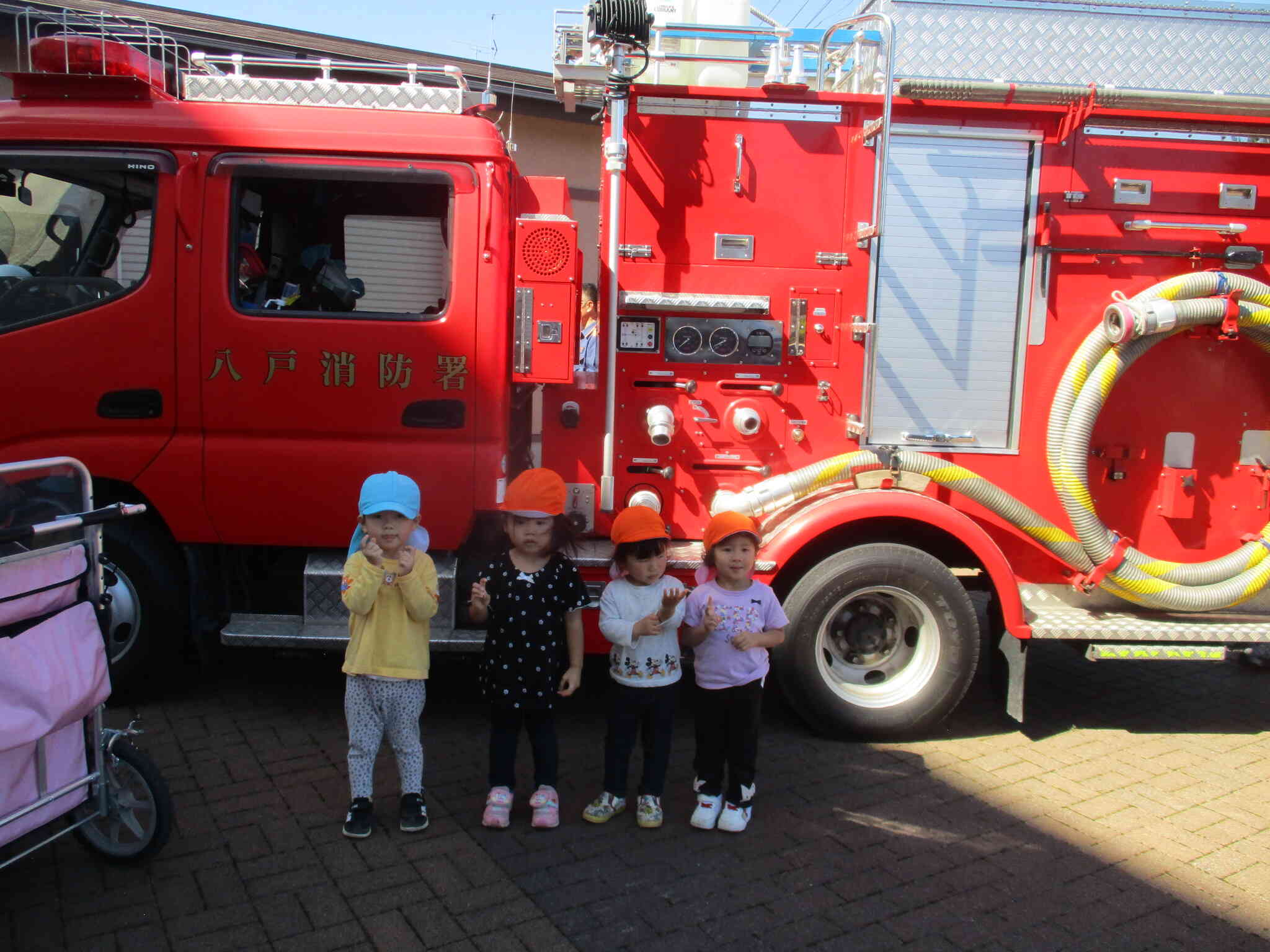 さあ帰ろうかなと思ったら、近くで消防車が見えたので、消防車の側まで行って消防隊員の方々と一緒に写真を撮らせて頂きました。赤い立派な消防車にみんな釘付けになって興味津々でした。
