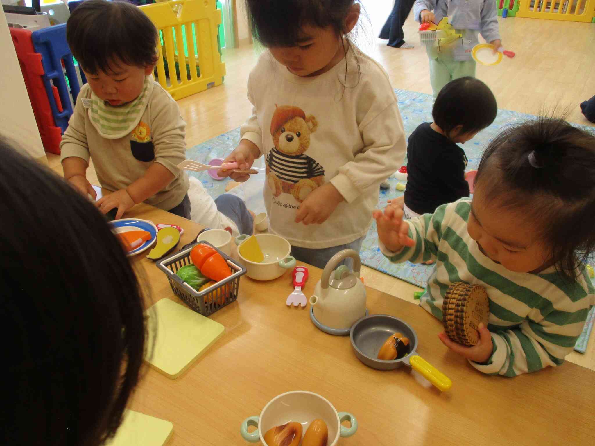 みんなでテーブルにおままごとを並べて「何が欲しいですか~」とお店屋さんごっこをしていました。
