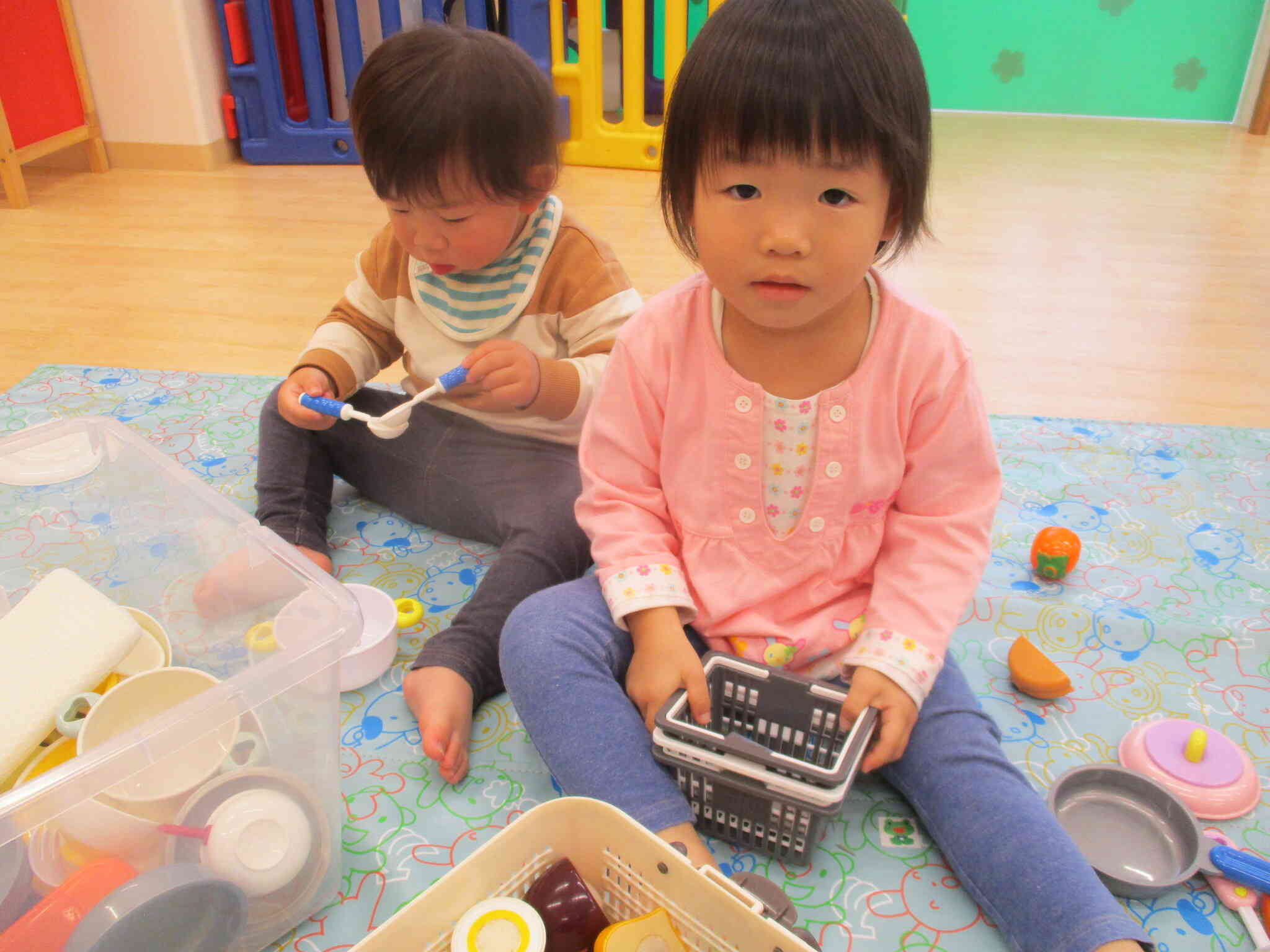 あひる組(1歳児)さんとひよこ組(0歳児)さんは、おままごとをしたり、車で遊んだりしました。