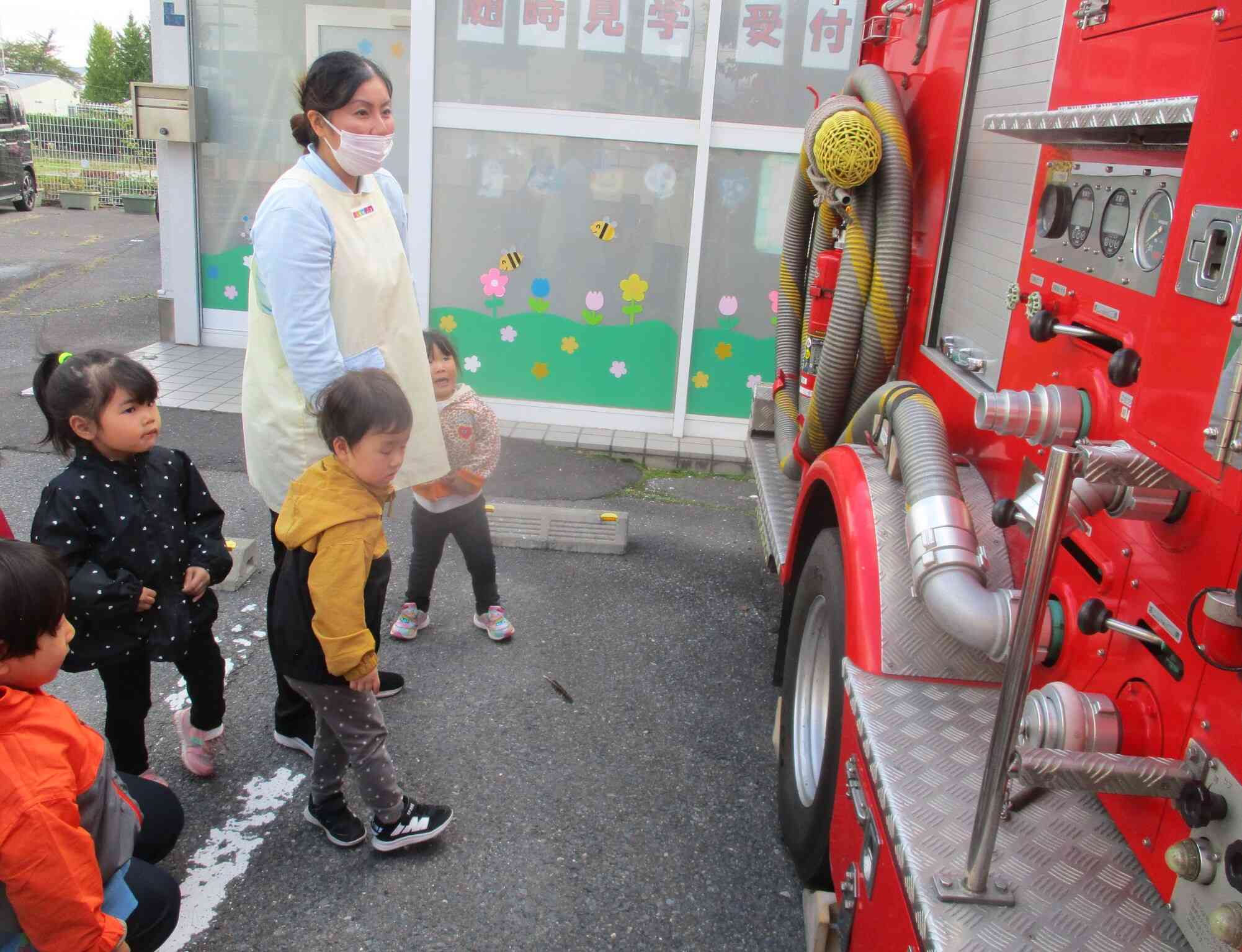 「今日は避難訓練で保育園に消防車が来ます」と子ども達に伝えると「まだかな。まだかな」と外を見て楽しそうに待っていました。