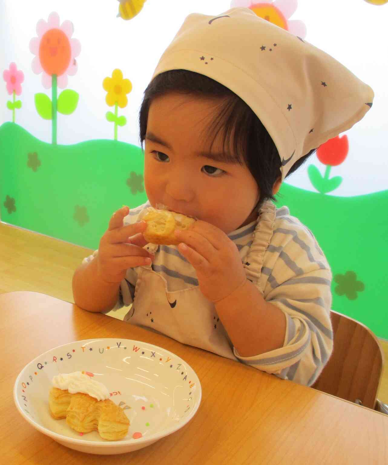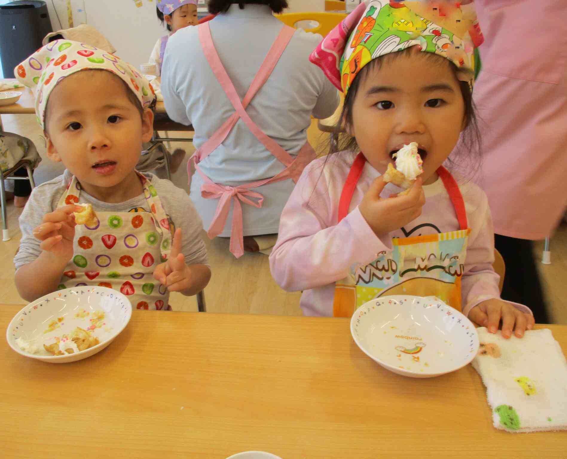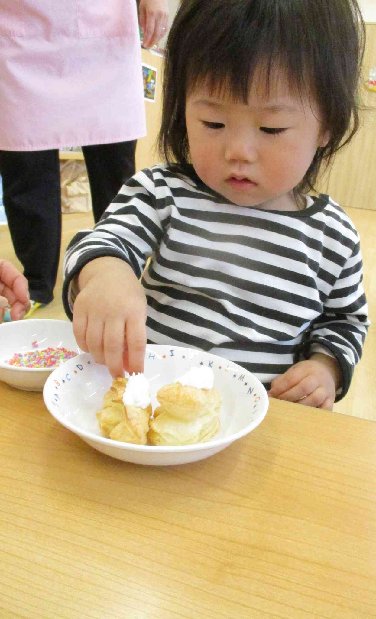 ひよこ組(0歳児)の子ども達もホイップクリームを絞ったりデコレーションをしました。