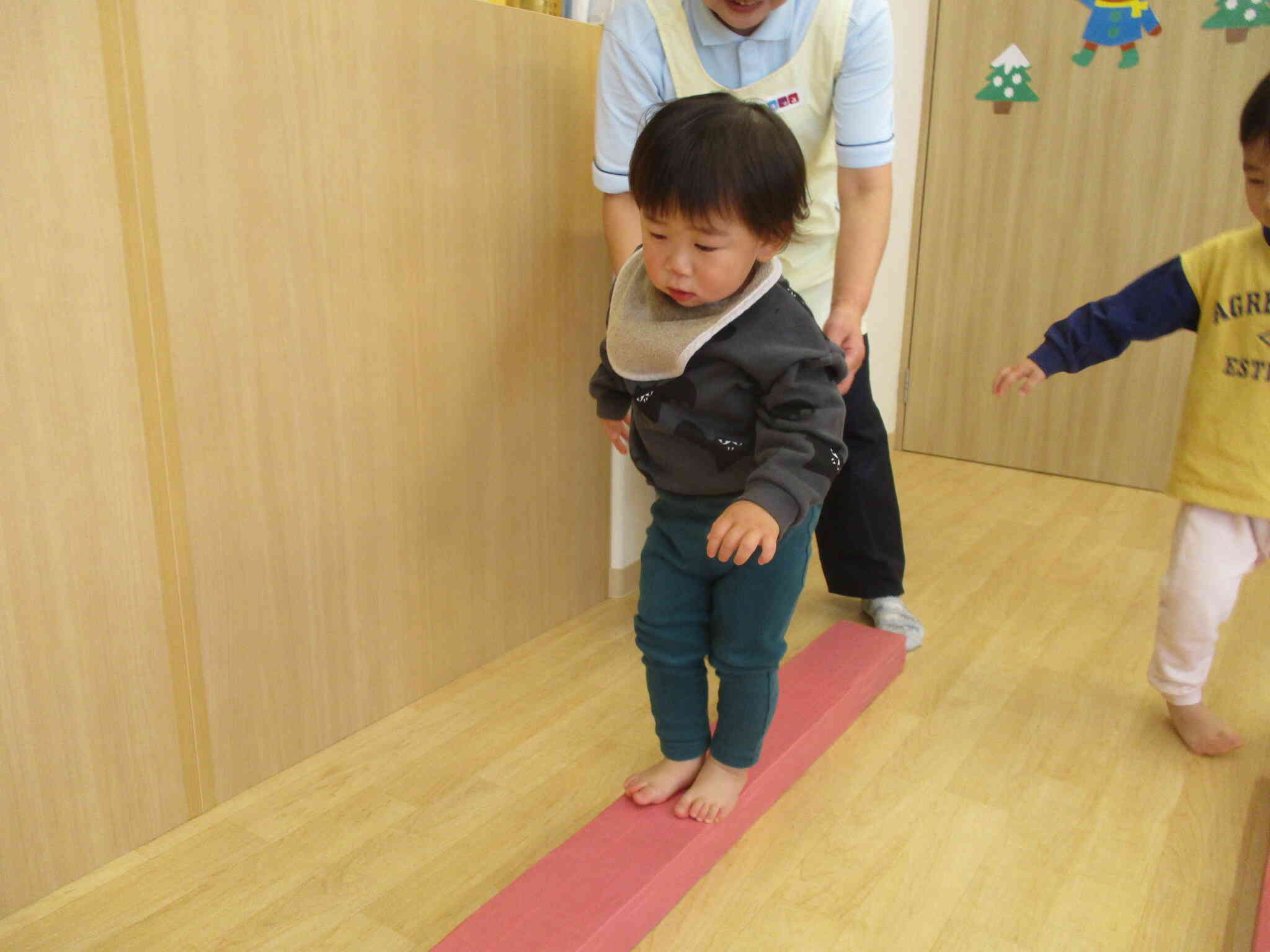 先生に介助してもらいながらも、端から端までの平均台を上手に渡り歩いていましたよ。