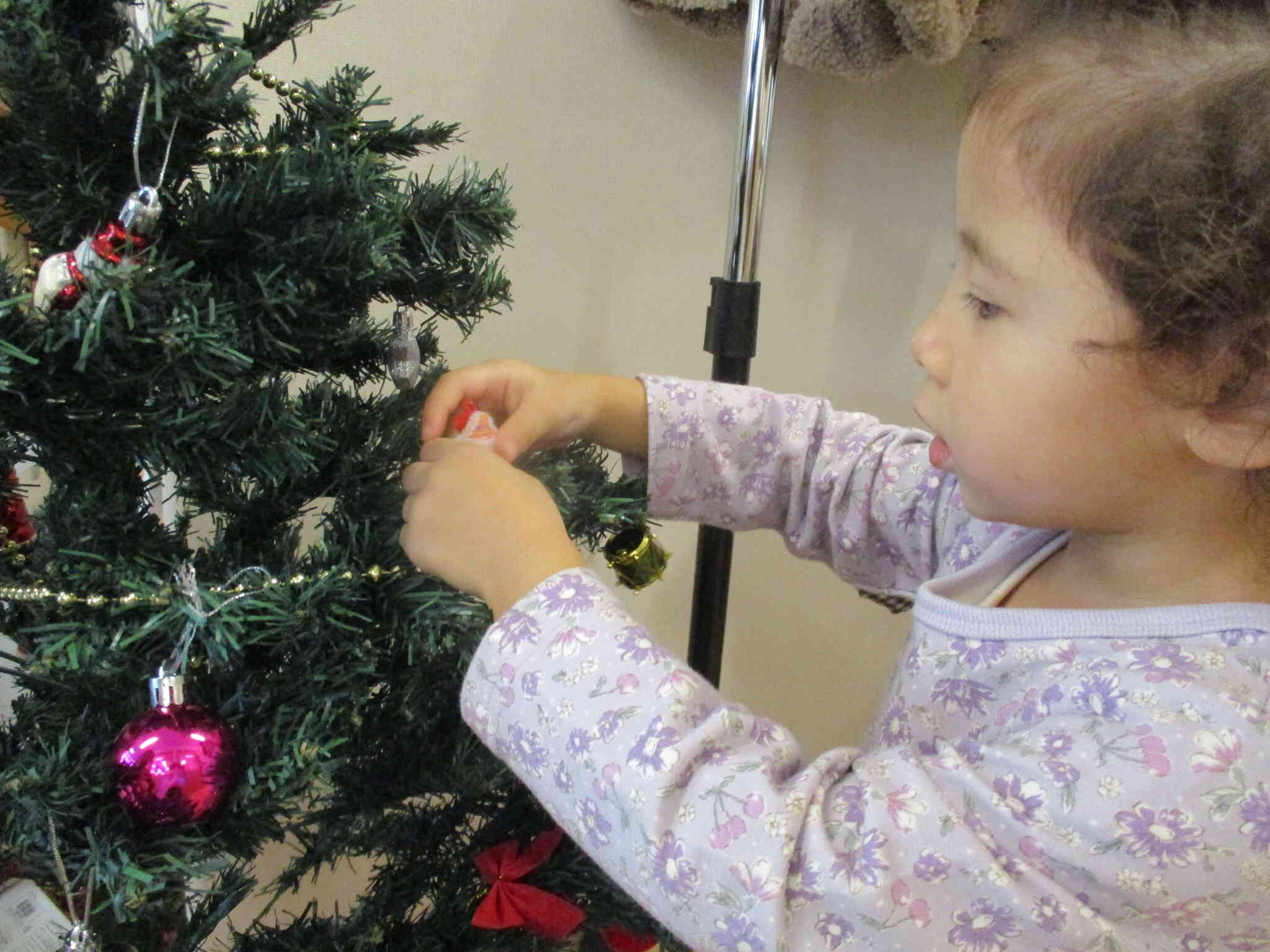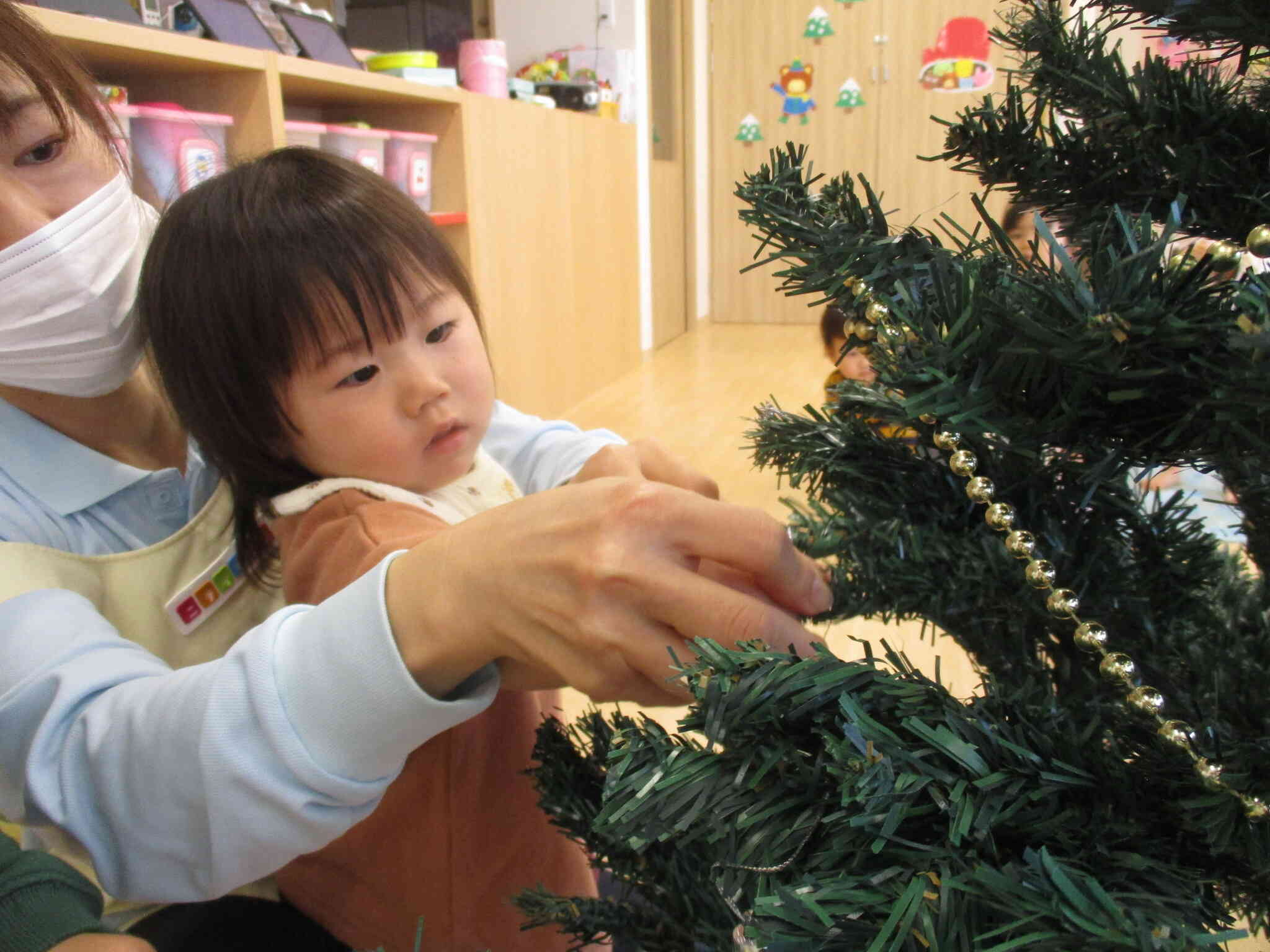 ひよこ組(0歳児)の女の子も先生と一緒にツリーに飾り付けをしました。