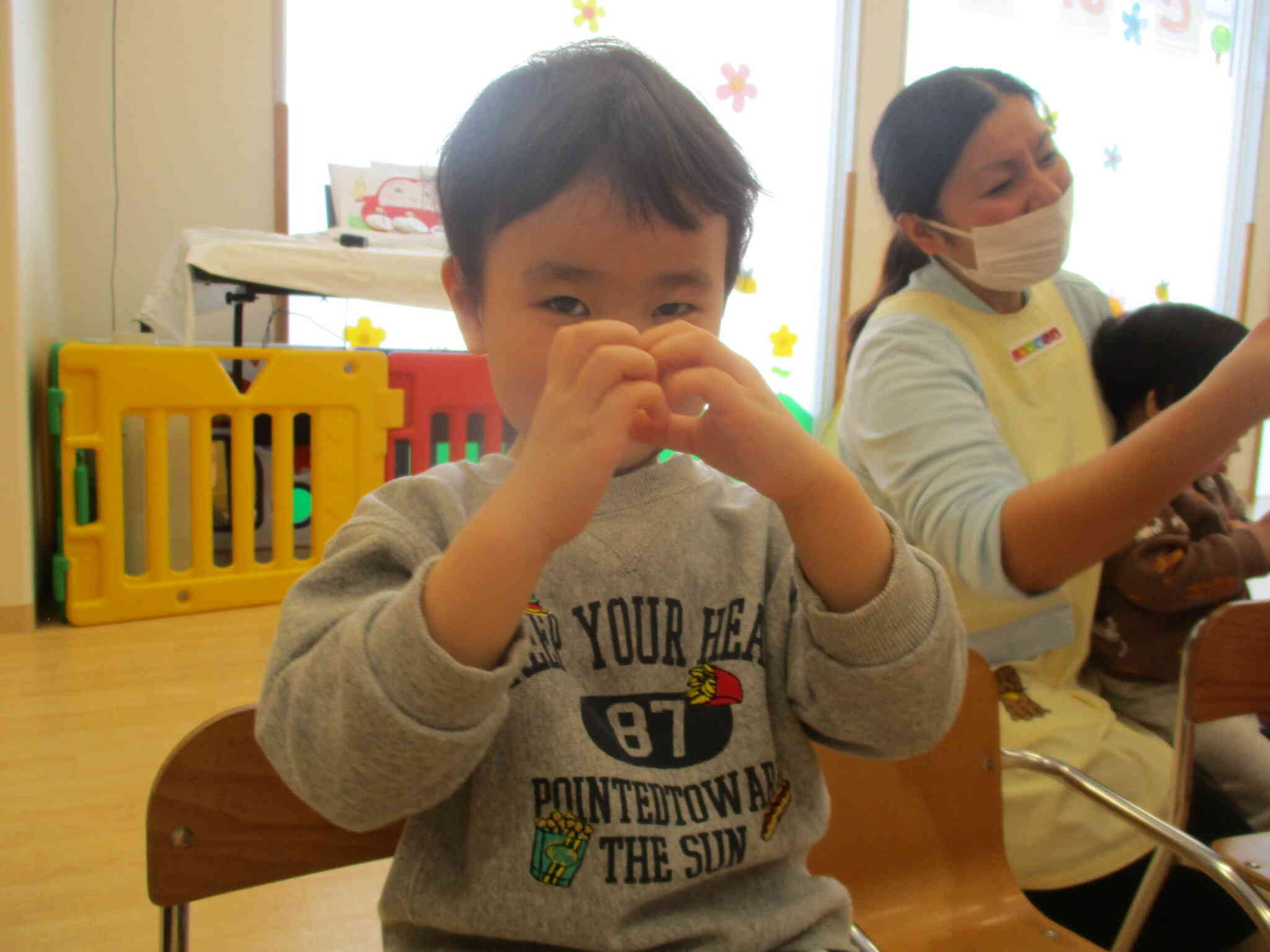うさぎ組(2歳児)の男の子は、手で上手にハートを作ってくれました。可愛らしいですね。