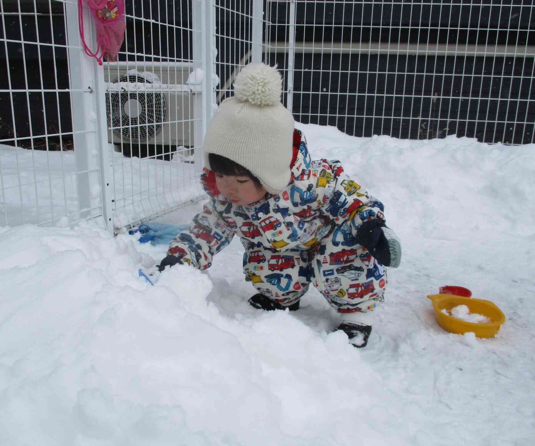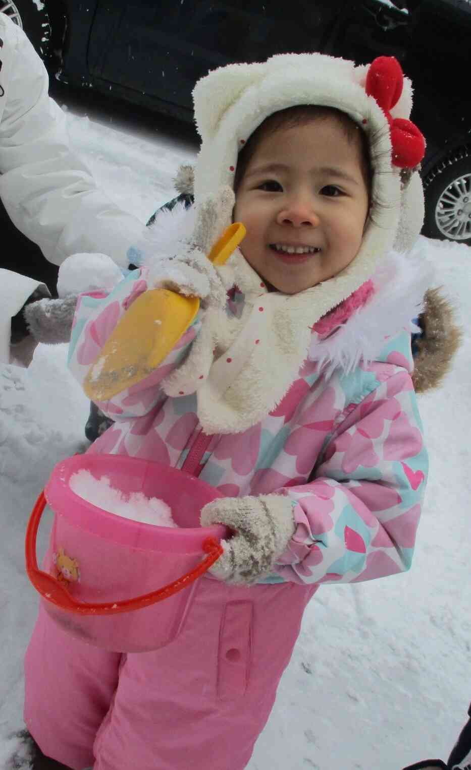 寒い中だったのでほっぺを少し赤くしながらでしたが、集中して雪遊びを楽しむ様子が可愛らしかったです。