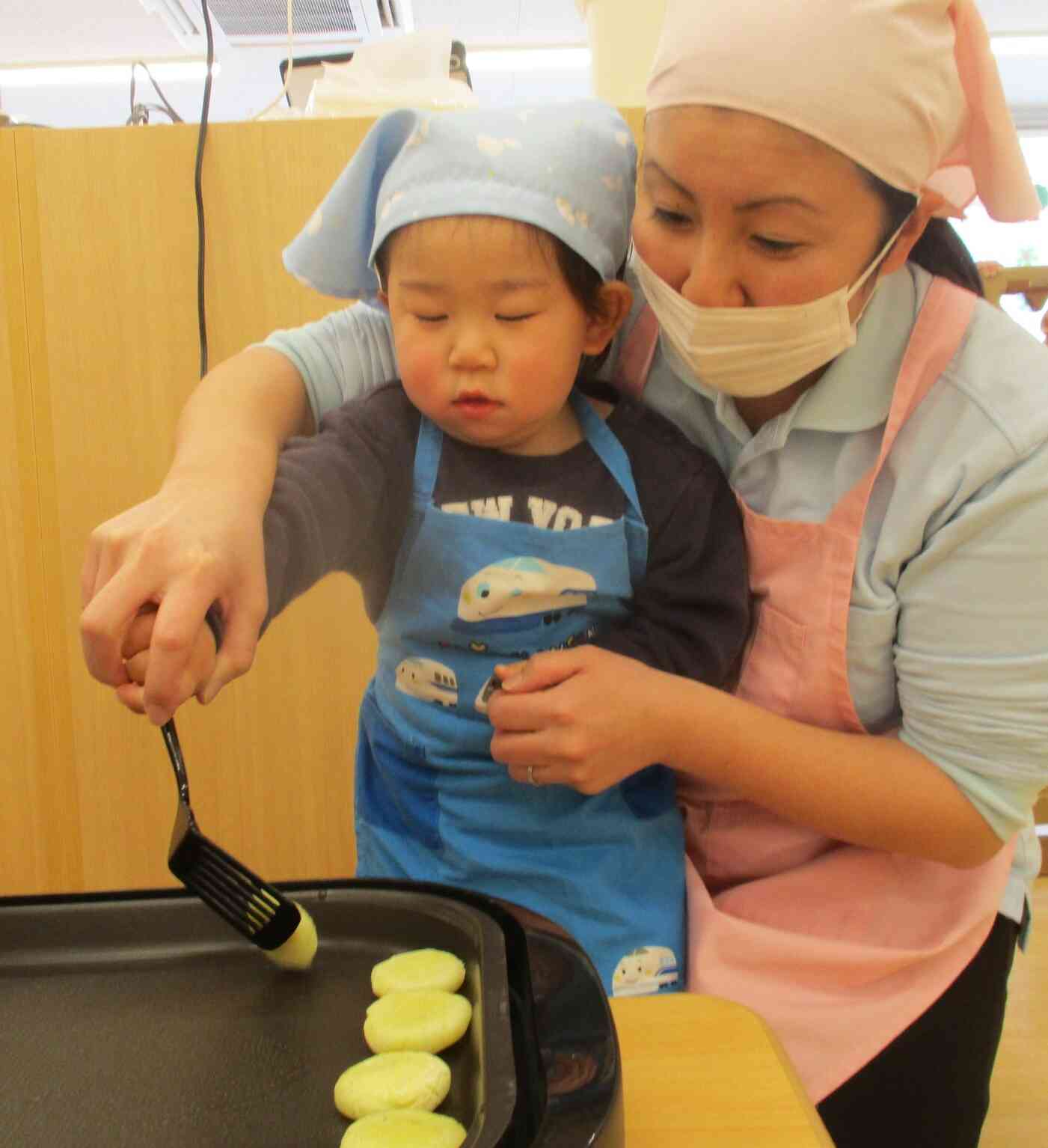 この後焼いてる途中から早く食べたそうにする姿も見られ、1歳児らしい姿だなと思い、先生達で笑ってしまいました。