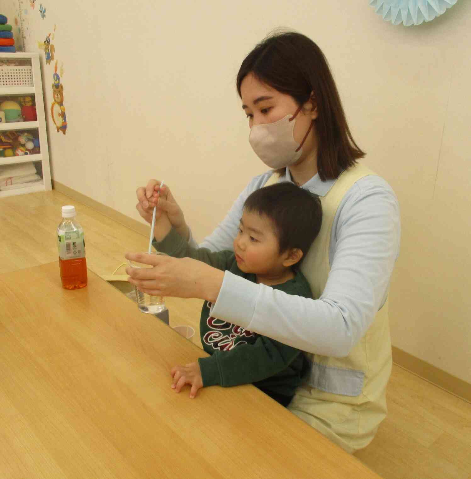 最後のお茶が水に変わるマジックでは2月生まれの男の子にも手伝ってもらい、先生とストローでくるくる混ぜると色が変わる様子に興味津々でした。