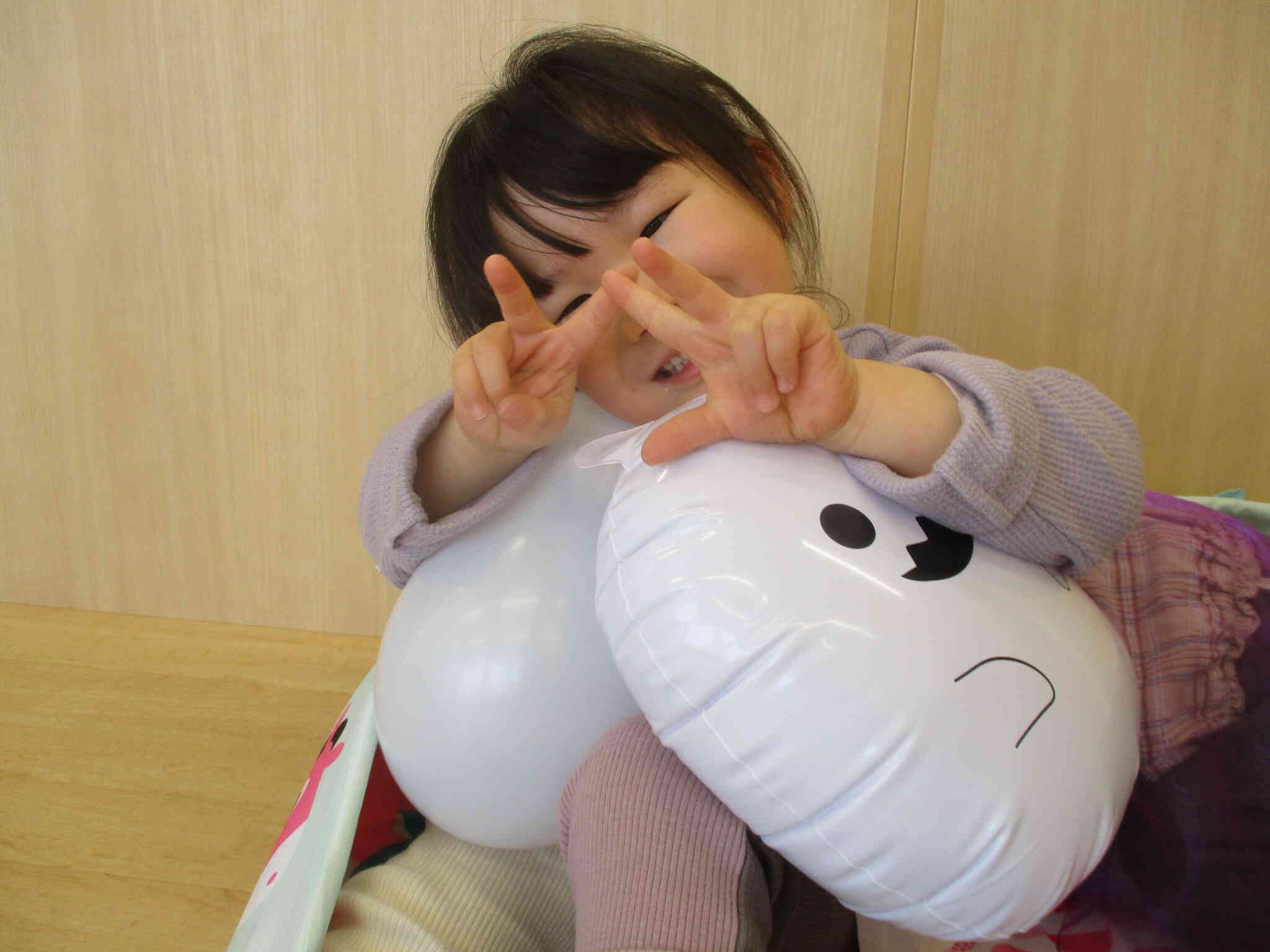 「何をして遊ぶ~?」の問いかけに、「風船!」と元気に答えてくれたうさぎ組(2歳児)の女の子。