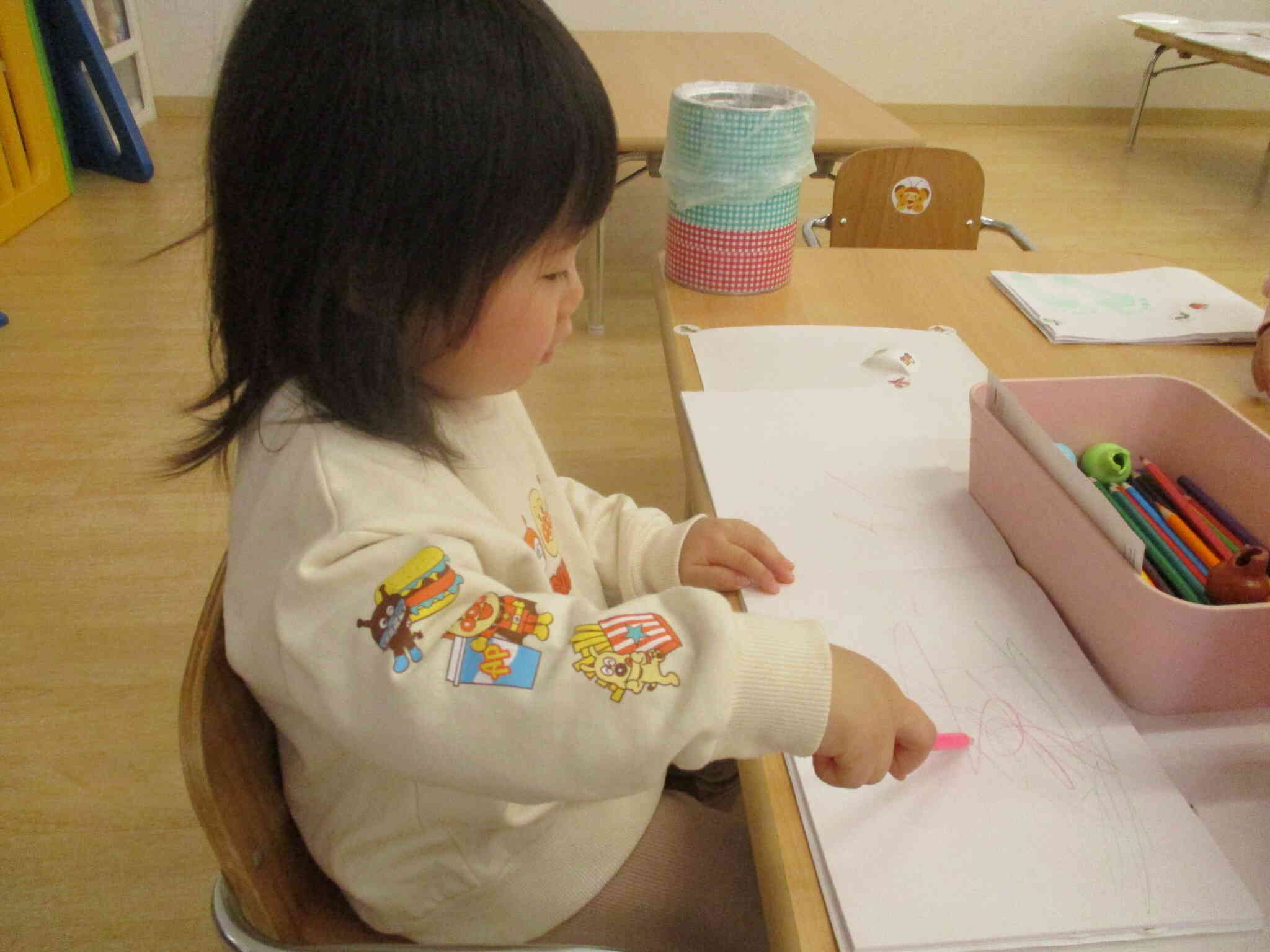 この日も一生懸命にピンクの色鉛筆を持って、「かきかき~」と言いながらお絵描きを楽しんでいました。