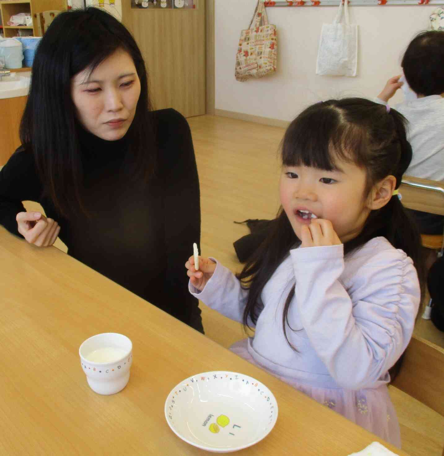 登園して最初は「いただきます」の挨拶をしておやつの時間です。
