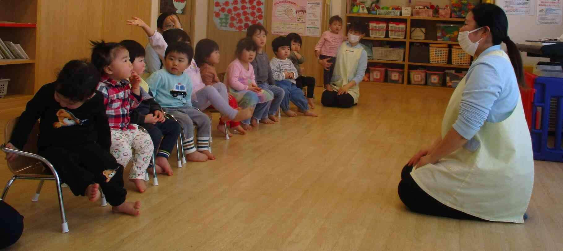 先生の真似をして歌詞を口ずさんだり、あひる組(1歳児)ひよこ組(0歳児)の子ども達は身体を揺らしてリズムを取る可愛い姿も見られました。